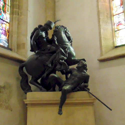Donner „made the equestrian statue St. Martin and the Beggar for the high altar of the Cathedral (1736), an over-life-sized lead sculpture combining classicistic clarity with touches of realism ... the warrior saint wears an 18th-century hussar's uniform rather than classical dress.”