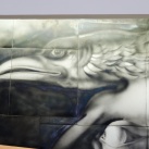 A kép domináns formája az "Arc", amit a természet gomolygó elemei vesznek körül – mint a lendület által gerjesztett energiahullámok. A fejre egy sasmadár simul, fenyegető csőrével, zeuszi erőt kölcsönözve az ábrázolásnak http://www.sacrumimperium.hu/sacr0205.htm A fej füle környékén azonban jelentős változás látható. Lángocskák sokasága áramlik szerte-szét, innen indulva. Most már tudom, "Lángoló kulcsok". Ám azt nem látom, mit nyitnak/nyitnának, a fegyelmezetten álló, fáklyát tartó nő felé áramlanak, ill. rajta is túl. Félelmetes látomás.