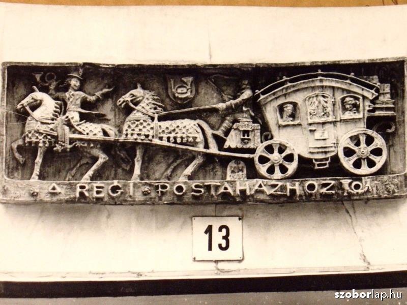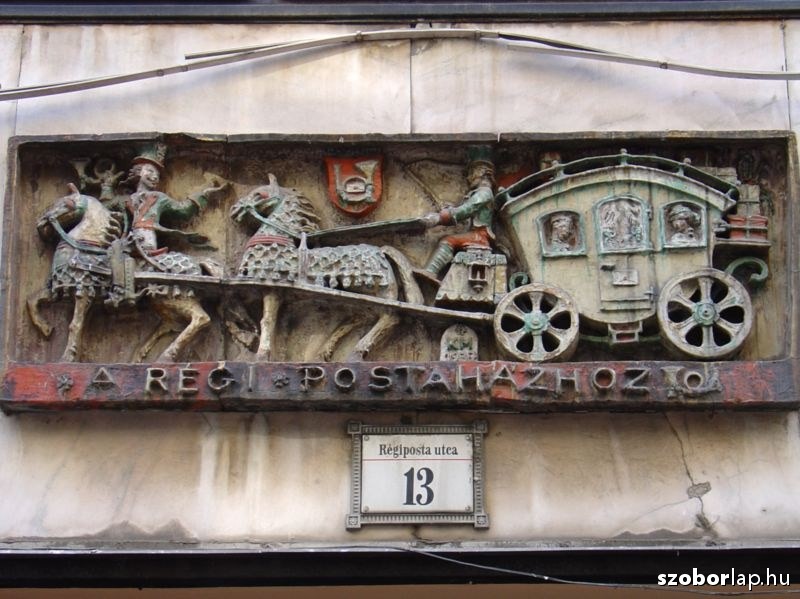 Ez a relief hangulatával, színeivel különösen kellemes eleme a belvárosi épületnek. Régi idők elevenednek meg a két ló által vontatott postakocsi láttán, amit nem csak a kocsis hajt, de az első lovon lovagló nevető postás révén különösen vidám képet ad.