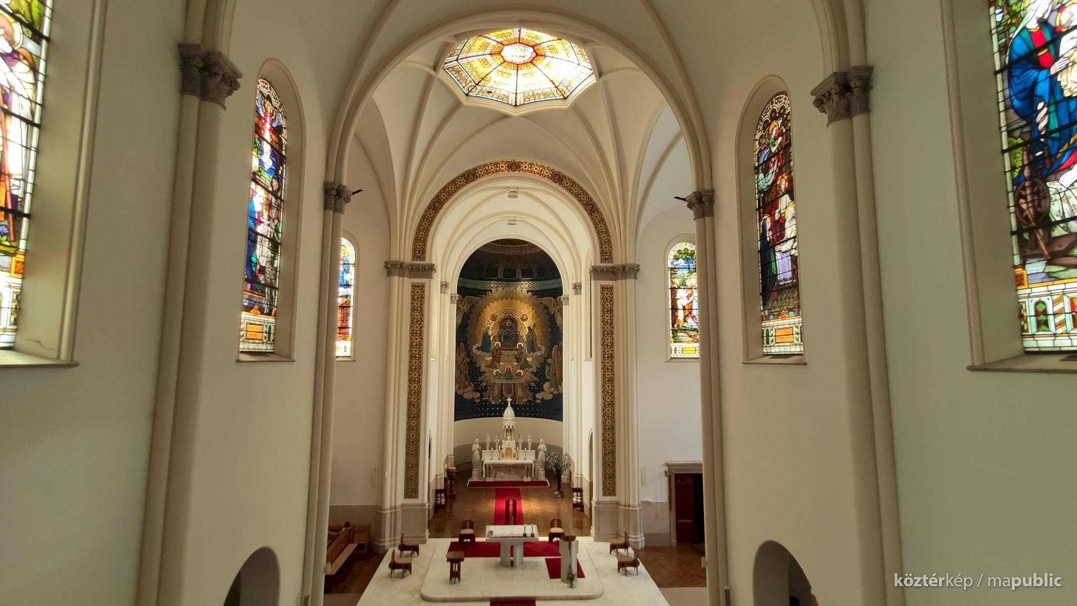 A szentély falát Zsellér Imre azonos című mozaikja burkolja és a forrás információja szerint ez Kelet-Európa legnagyobb ilyen jellegű alkotása. Mintájául a meráni zárdatemplom mozaikja szolgált. Ezt szerettem volna az összehasonlítás kedvéért megkeresni és megmutatni, de sajnos nem találtam. Másrészt egy talált információ szerint úgy tűnik, az egykori templomot már lebontották, valószínűleg a mester egy rajz, vagy metszet alapján készítette ezt a művet.