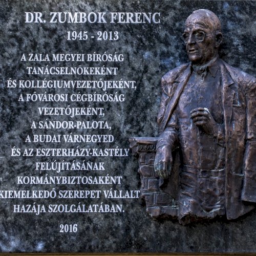 A tábla felirata: "DR. ZUMBOK FERENC / 1945--2013 / A ZALA MEGYEI BÍRÓSÁG TANÁCSELNÖKEKÉNT, A FŐVÁROSI CÉGBÍRÓSÁG VEZETŐJEKÉNT, A SÁNDOR-PALOTA, A BUDAI VÁRNEGYED ÉS AZ ESZTERHÁZY-KASTÉLY FELÚJÍTÁSÁNAK KORMÁNYBIZTOSAKÉNT KIEMELKEDŐ SZEREPET VÁLLALT HAZÁJA SZOLGÁLATÁBAN. 2016"