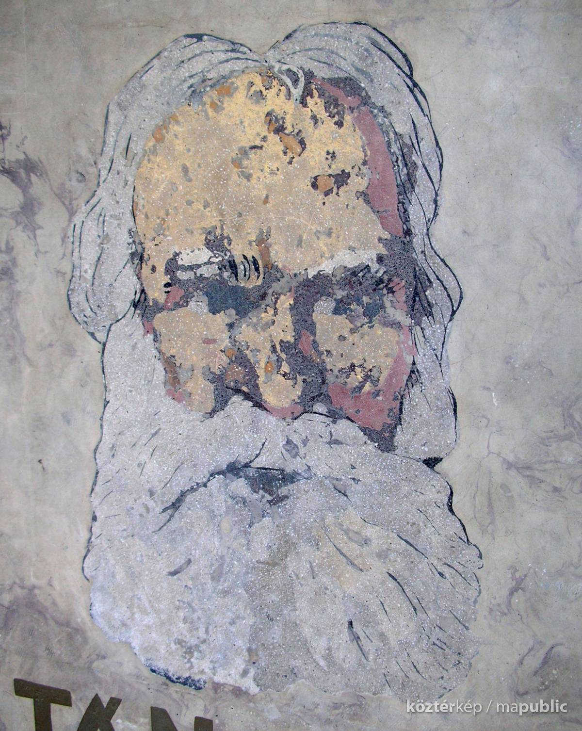 Az alkotás nagyon érdekes, mert különböző színű műkőből, vagy kőzúzalékból van kirakva az író portréja.