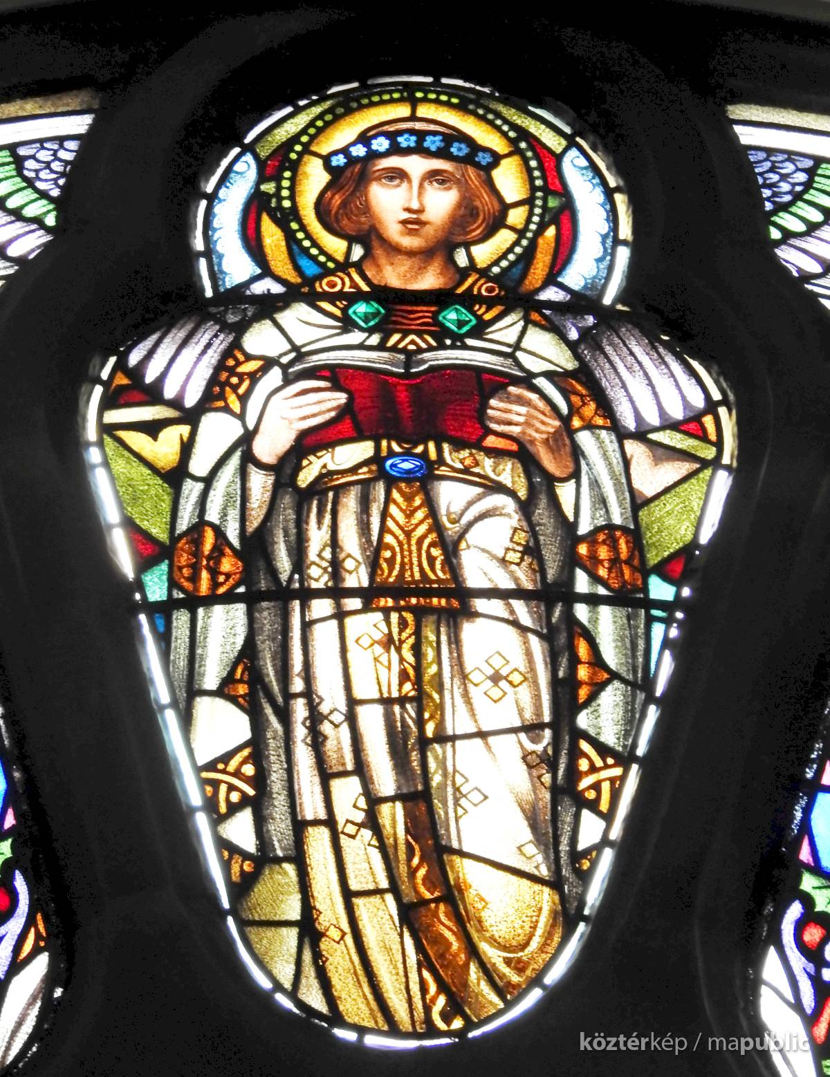 Szent Cecilia képe gyakran jelenik meg a kórus feletti ábrázolásokban. Itt a leírtaknak megfelelően szép és finom eleganciával öltözött nőként játszik az orgonán, körülötte az ablak egy-egy cikkelyében angyalok sora különböző hangszereket szólaltatnak meg (hárfa, lant, trombita, stb.), hozzájuk társul az énekszó is.