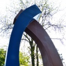 Festett szobor az alkotórészek színe különböző. A két változó méretű négyzetalaprajzú hasáb, lehet pontosabb "négyzetalaprajzú hajlított oldalú elem...", egy ívben találkozik, fantáziadúsan érzékeltetve a barátságot.