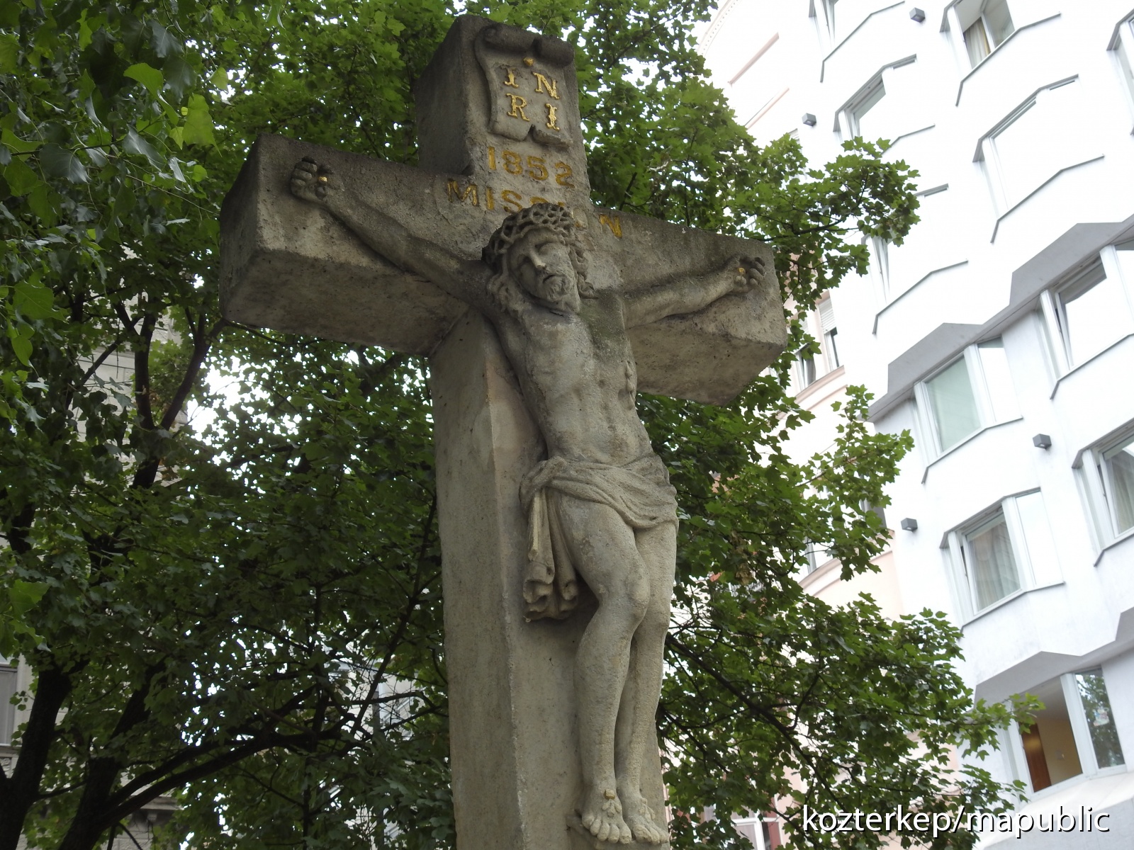 Az útmenti keresztet a Fabrikengasse (Gyár utca) végén (elején) állították fel, 3.2 m magas. (Budapest köztéri szobrai 1692-1945 Szöllőssy Ágnes szerk.)