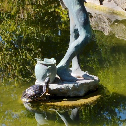 'A kezében rákot tartó fiú akt, lábánál a kifogott állatok számára szolgáló csuporral, hangulatos környezetbe, a sziget északi részén található mesterséges vízesés tavában utólag kialakított kis szigetecskére került.