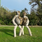 "...rendhagyó technikával készült: [a szobrász] felforrósított acélhuzallal formára vágott hungarocell elemekbe öntötte a betont. Kétféle cementet használt, egy világosabbat a figurák kezéhez-lábához, és egy sötétebbet a hasukat formázó egymásnak feszülő gömbökhöz.