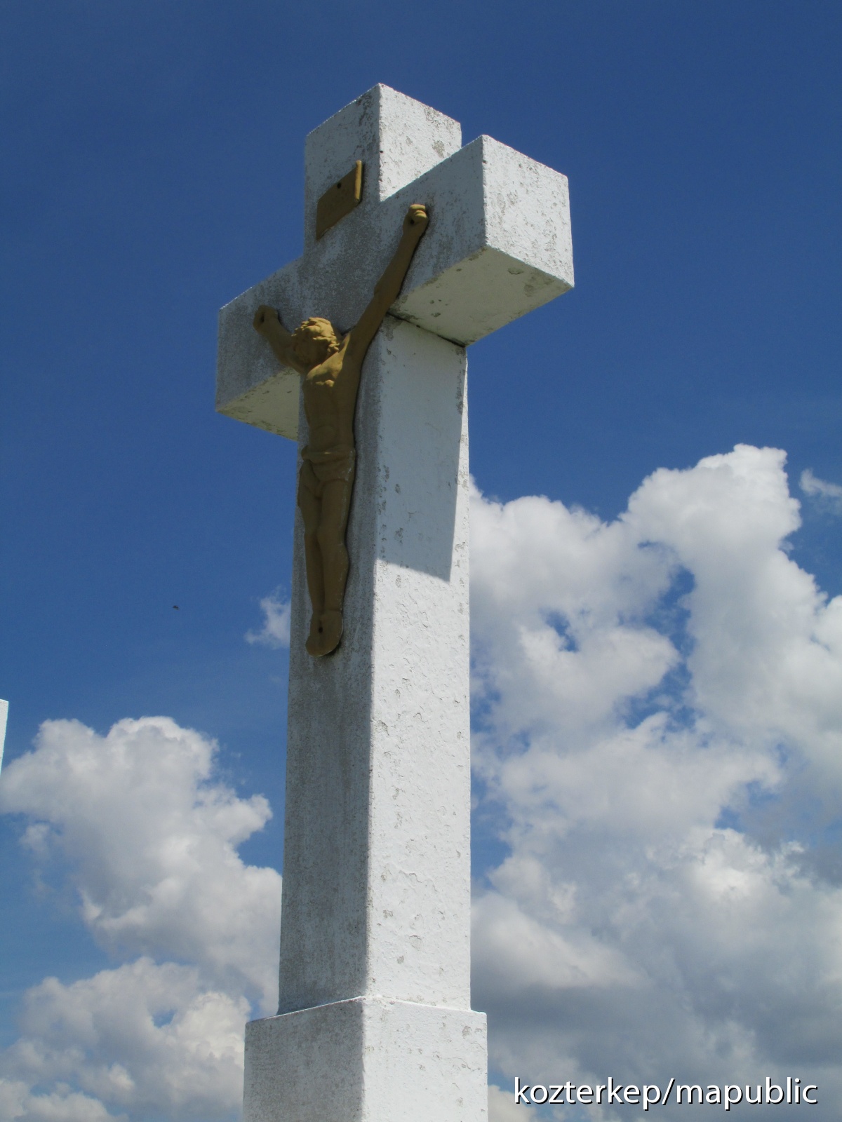 A kálvária három keresztjéből kettőn nincs figura (a latrok hiányoznak), a középső kereszten régi Krisztus-szobor látható. A keresztek felső részét láthatóan kicserélték, valószínűleg műkő kereszt került az eredeti homokkő keresztek helyére. A keresztek alsó részén, ahol nem takarja a festék, látható az eredeti faragott kő. A kálvária kereszteket fehérre festették, így nem állapítható meg, hogy volt-e eredetileg felirat a keresztek talapzatán.