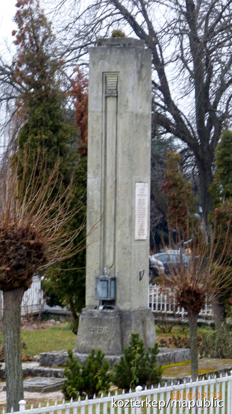 A I. világháborús rész előbb került fölállításra, két oldalán márványtáblán sorolják föl a hősök-áldozatok neveit. A fölállítás 1942-ben történt, alkotó: Berecz Gyula.