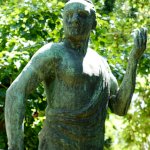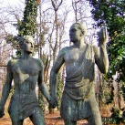 A síremlék két görögösen öltöztetett férfi természetes méretű alakja, síremléknek talán monumentális is lehet. Érett és fiatalabb szobortestük klasszikus, nem a síremlékek fájdalmas, gyászt bemutató temetői társait példázza. A lépcsőn felfelé haladó, kézfogással kapcsolatban lévő, a fiatalabb a korosabbat követő, előre és visszatekintő egymás tekintetét kereső, figyelő alak csak képletesen fejezi ki az elmúlást. Tétova mozdulatuk az elválást, távozást mutatja, a felfelé haladás, az előbb álló idősebb férfi sejtelmesen felfelé lendült bal karja is inkább magyaráz mintsem az irányt, az örökre eltávozást jelentené.