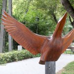 Fából készült, feltűnően szépen megmunkált madárszobrai a Kék tónál, a nagy fák kellemes árnyékában szépen illeszkednek a környezetbe.