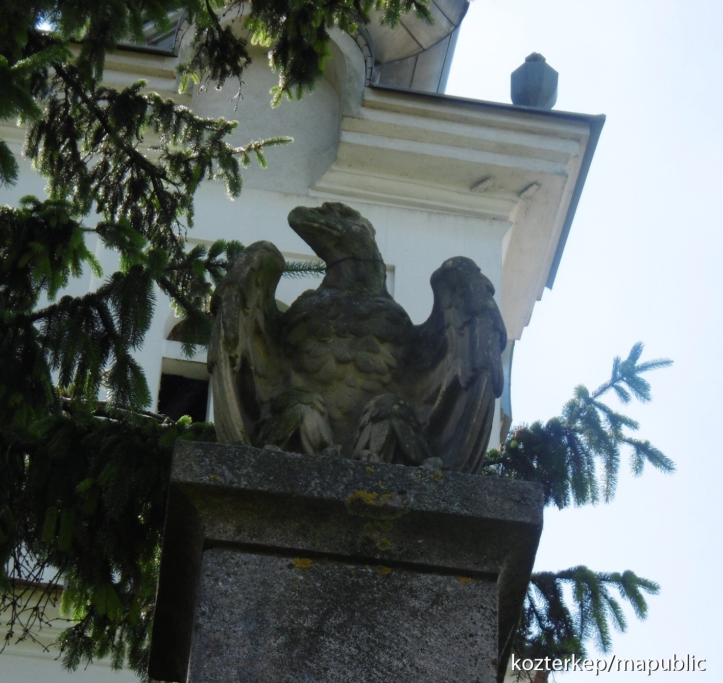 Az I. világháborús emlékmű a magasabb, habár a mellette álló fenyőfa még jóval föléje nyúlik és árnyékba is borítja. Az emlékmű karcsú pillérjének a tetején egy turul ül, félig kiterjesztett szárnyakkal.