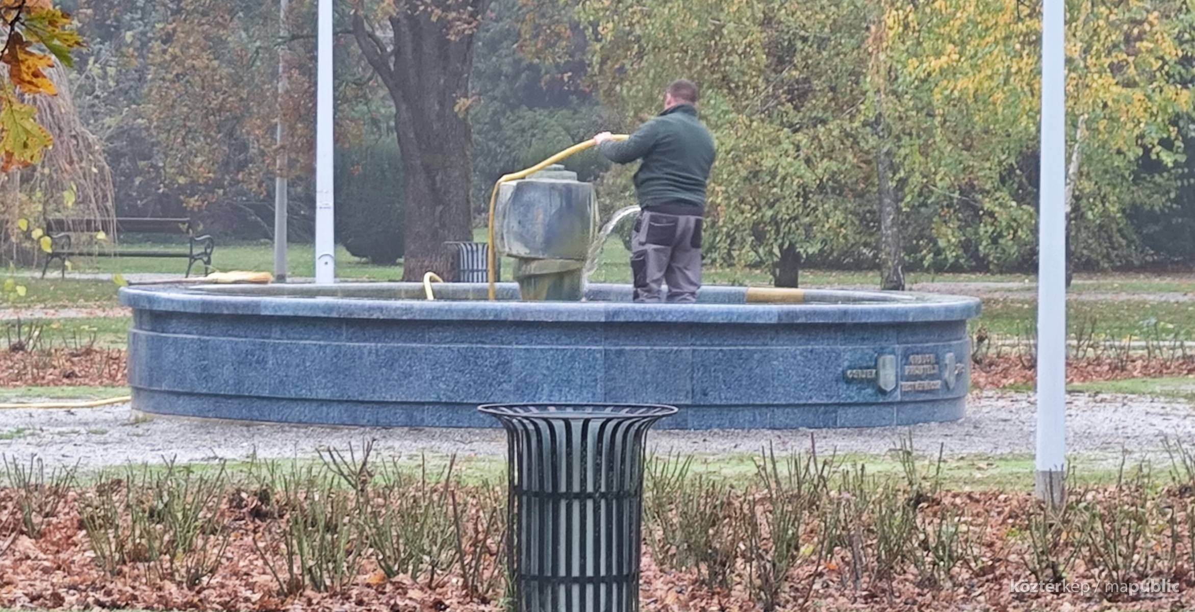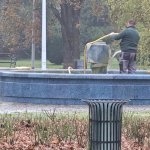 Nagyon szép botanikus kert Osijek központjában. Tényleg nem találtam szobrot de a gyönyörű napsütésben, valahol a park közepén egy szökőkutat láttam. Úgy voltam vele: a sétába belefér. Először az volt a föltűnő, hogy a közepén a vízkiömlő egy kerámia! Közelebbről megnéztem, tényleg. Ahogy jártam körbe a második szokatlan jelenség, a szökőkút kávájának magas fénye tűnt furcsának. Nem lehetett csiszolt kő. Ekkor már eldöntöttem, hogy mégis több képet is készítek. Körbe járva az árnyékos oldalon ért a meglepetés.