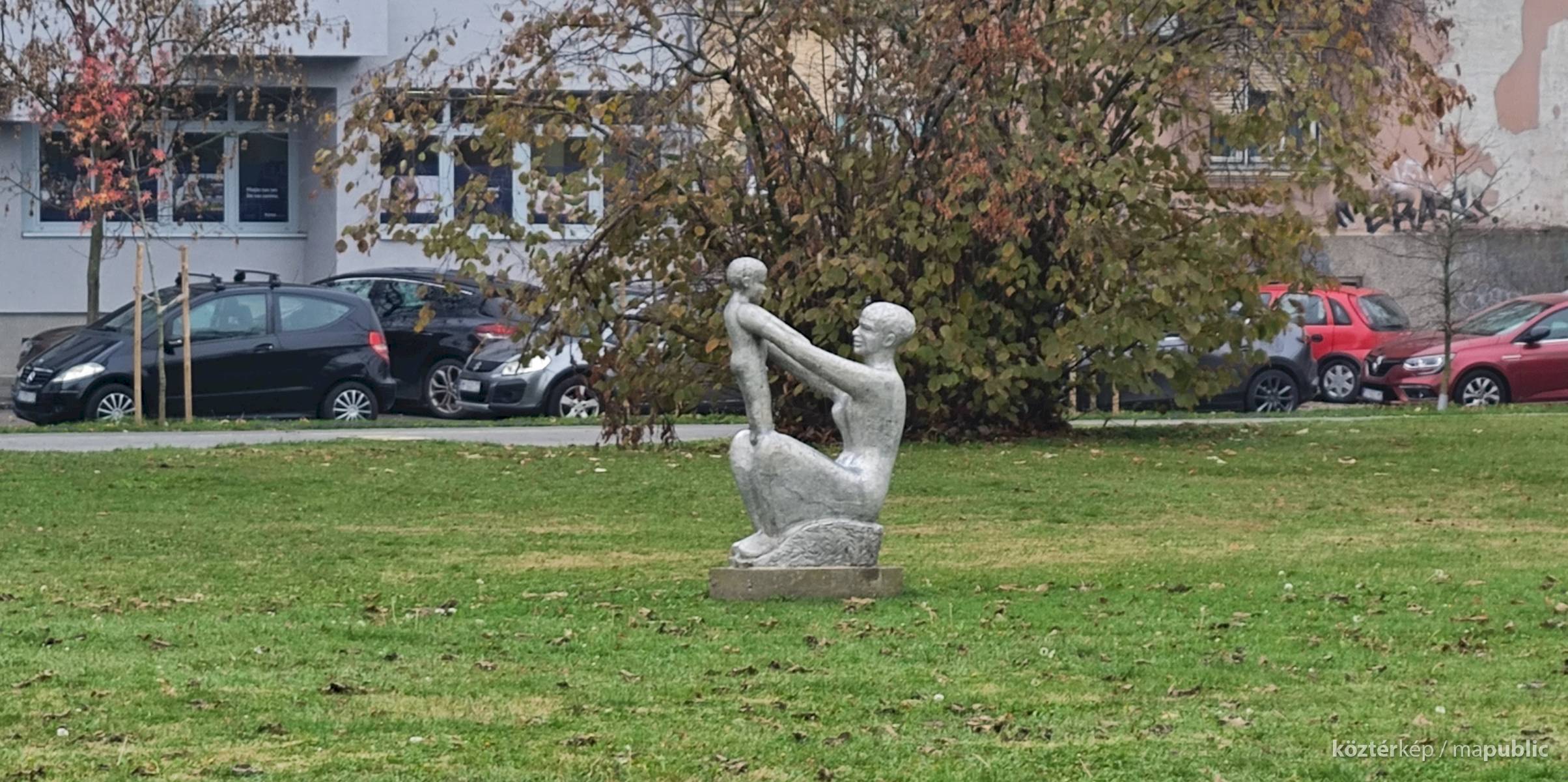 Az anya talapzaton ül és térdén áll a gyermek. A beton talapzat kereskedelmi termék.