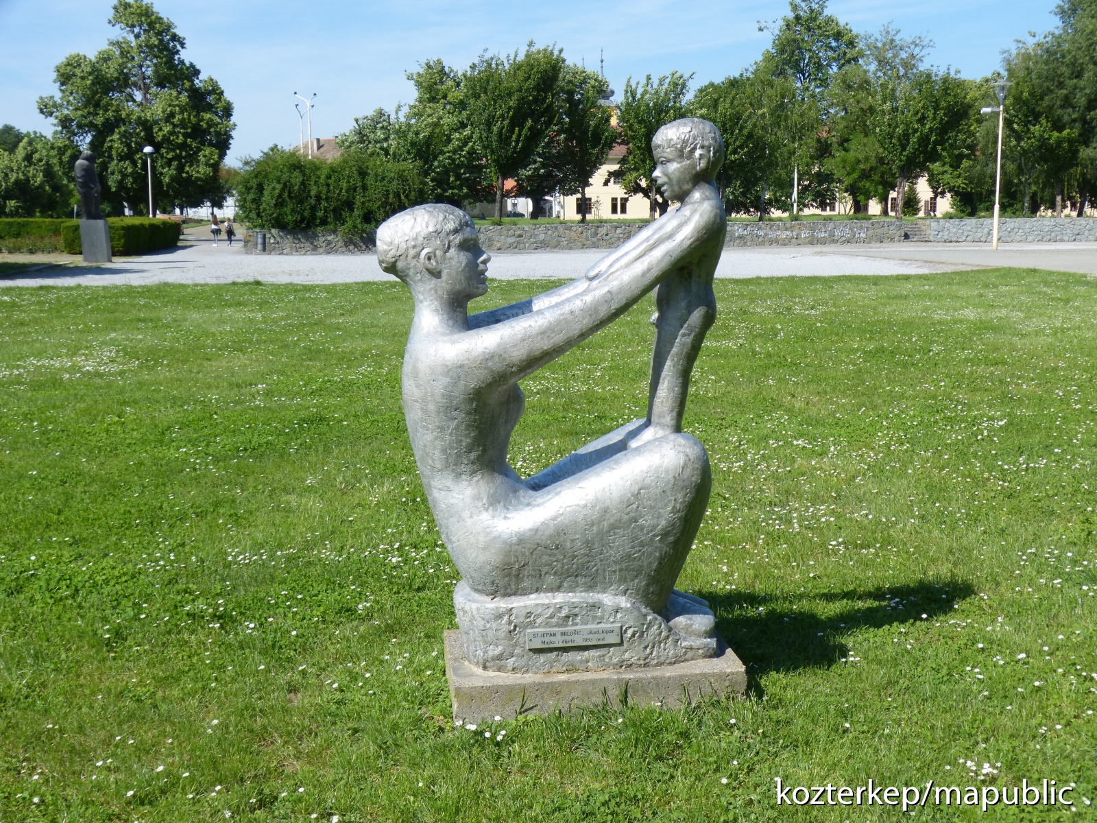 Az anya talapzaton ül és térdén áll a gyermek. A beton talapzat kereskedelmi termék.