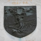 A névsor fölé pajzs alakú bronztábla van a kőre erősítve. A dombormű központi alakja egy katona. Még áll, de bal kezét szívére szorítva éppen hátrahanyatlik, jobb kezéből már kihullott puskája földre esett, a sisakjával együtt. Az alaktól balra és jobbra felirat van: