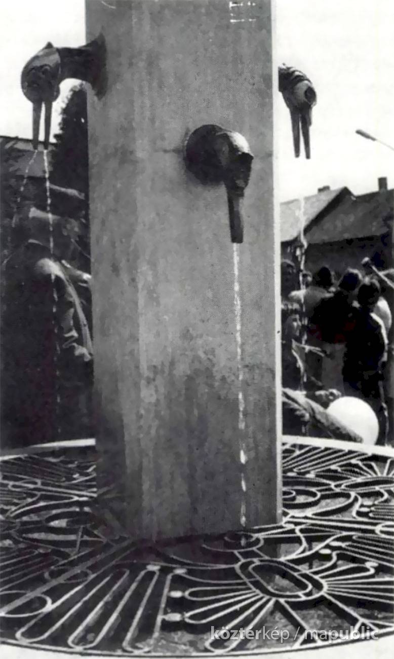 Az oszlop négy oldalán patinázott madárfejek láthatók - mindegyik más-más - csőrükből folyik a víz.
