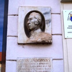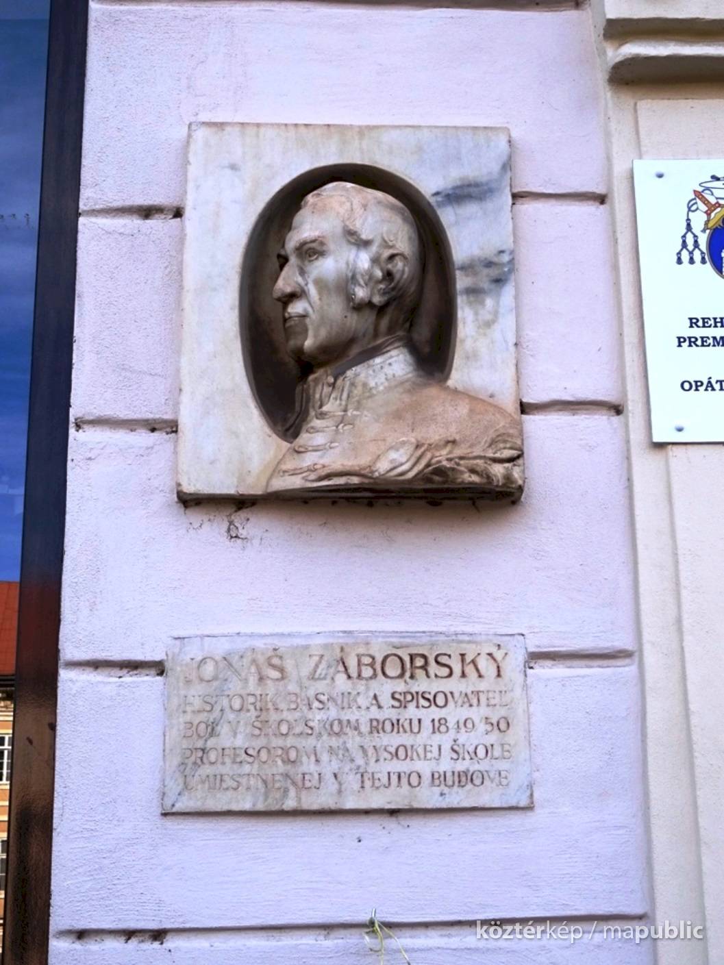 A fehér márványtábla már 1926 óta díszíti az egyetemi templom és volt kolostor épületét. A felirata szlovák nyelvű, de ennek magyar fordítása: "Jonáš Záborský történész, költő és író az 1849/50. iskolaévben professzora volt az itt elhelyezett főiskolának"