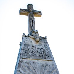 A síremlék fő alakja egy botjára támaszkodó agg férfi aki már az életútja vége felé halad. Vele szemben a kőtábla szövege német nyelven gót betűkkel így szól Sarkady Sándor soproni költő fordításában: