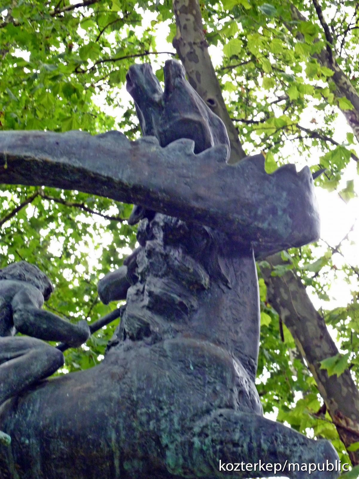 A "sárkánykígyó" által megtorpantott lovat szőrén ülő, ruhátlan szent dárdájával végez a szobor keretét adó mitikus szörnnyel. Nagy Szent Györgye eltér az általánosan megjelenő más sárkányölő Szent György szobroktól. (Pl: https://www.google.hu/search?client=firefox-b&biw=1024&bih=622&tbm=isch&sa=1&q=szent+gy%C3%B6rgy+szobrok&oq=szent+gy%C3%B6rgy+szobrok&gs_l=psy-ab.12...39027.42306.0.46887.7.7.0.0.0.0.182.1100.0j7.7.0....0...1.1.64.psy-ab..0.6.943...0j0i30k1j0i5i30k1j0i24k1j0i13k1j0i13i5i30k1.lH4vU6MZrmQ) Az ő lovagja nem visel lovagi öltözetet, vértet, Ő egy egyszerű egyenes dárdával végez az inkább kínaias, lábatlan, kígyófejű sárkányával. Ez a sárkány a magyar népmesék forgószélben érkező fenevadja és egy népmesébe, mondába illő fiatal férfi végez vele - olvasatomban. A szobor sugallja, hogy nem kell vitéz lovagnak lenni ahhoz, hogy legyőzzük saját sárkányainkat. A forgó, tekergő vészt, káoszt legyőzi az egyenes dárda.