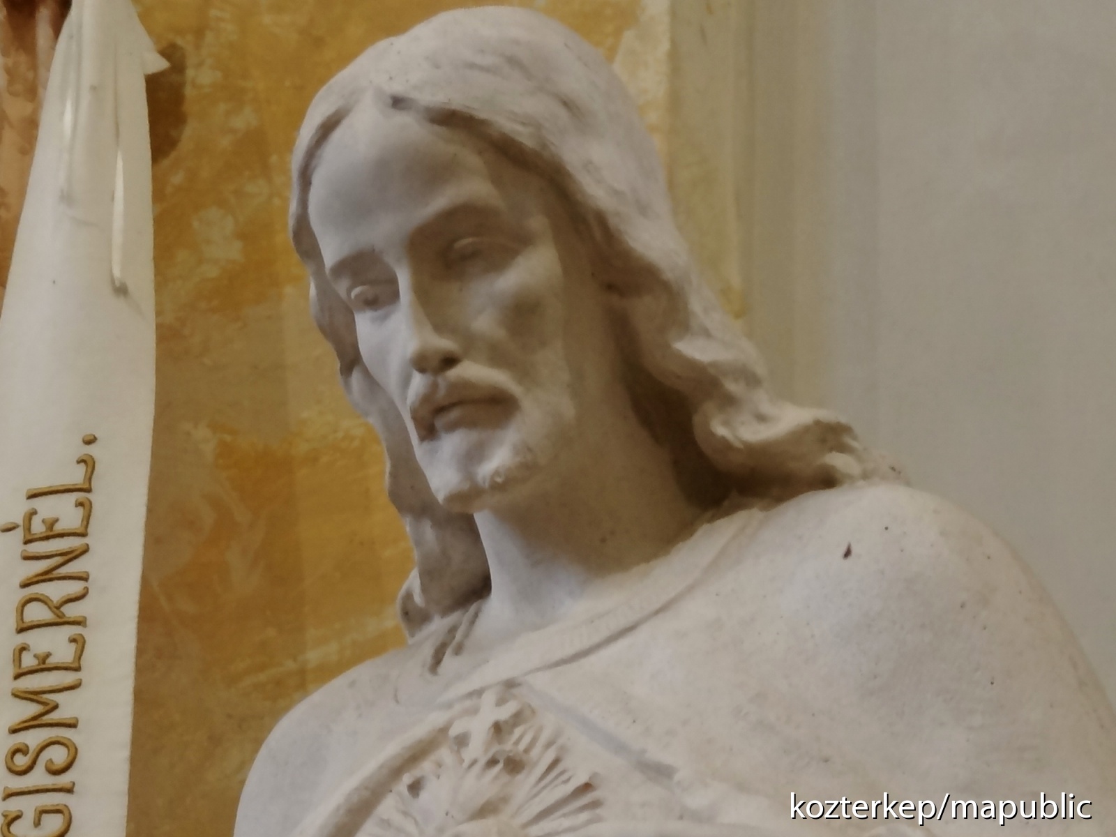 A templom belsejében, Palka József üvegablakai alatt sorban állnak azok a szobrok, amiket Krasznai Lajos mintázott. A jobb oldalon áll a Jézus szíve ábrázolás (szemben a Mária szíve szoborral).