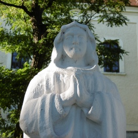 Az oszlop két oldalán egy-egy női szobor áll. A balra lévő, idősebb arcú nyilván Mária, Jézus édesanyja. A jobbra álló, fiatalabbnak látszó nő könyvet tart kezében, ő Mária Magdolna.