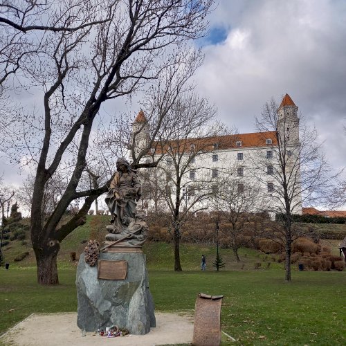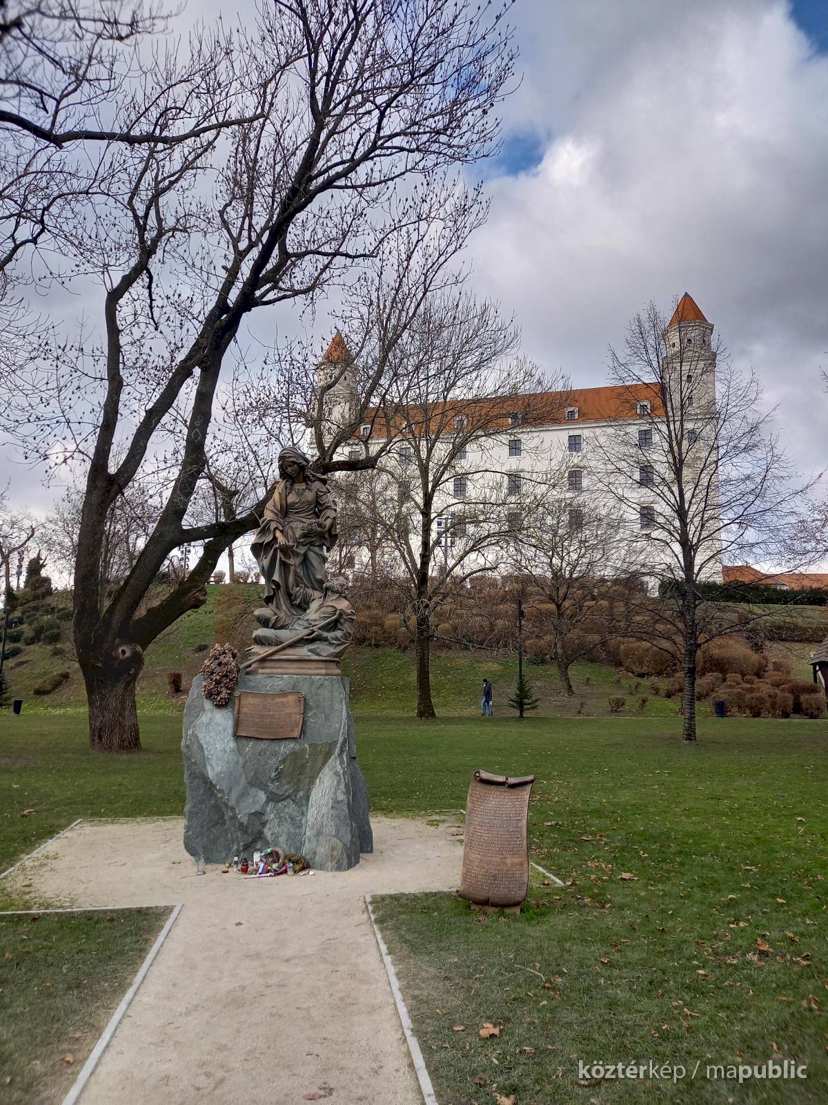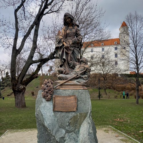 A szobor Erzsébetet ábrázolja, amint kenyeret nyújt egy szegény koldusnak. A kötényében ábrázolt rózsák Erzsébet attribútumai: a legendaváltozatok rózsacsodájára utalnak.
