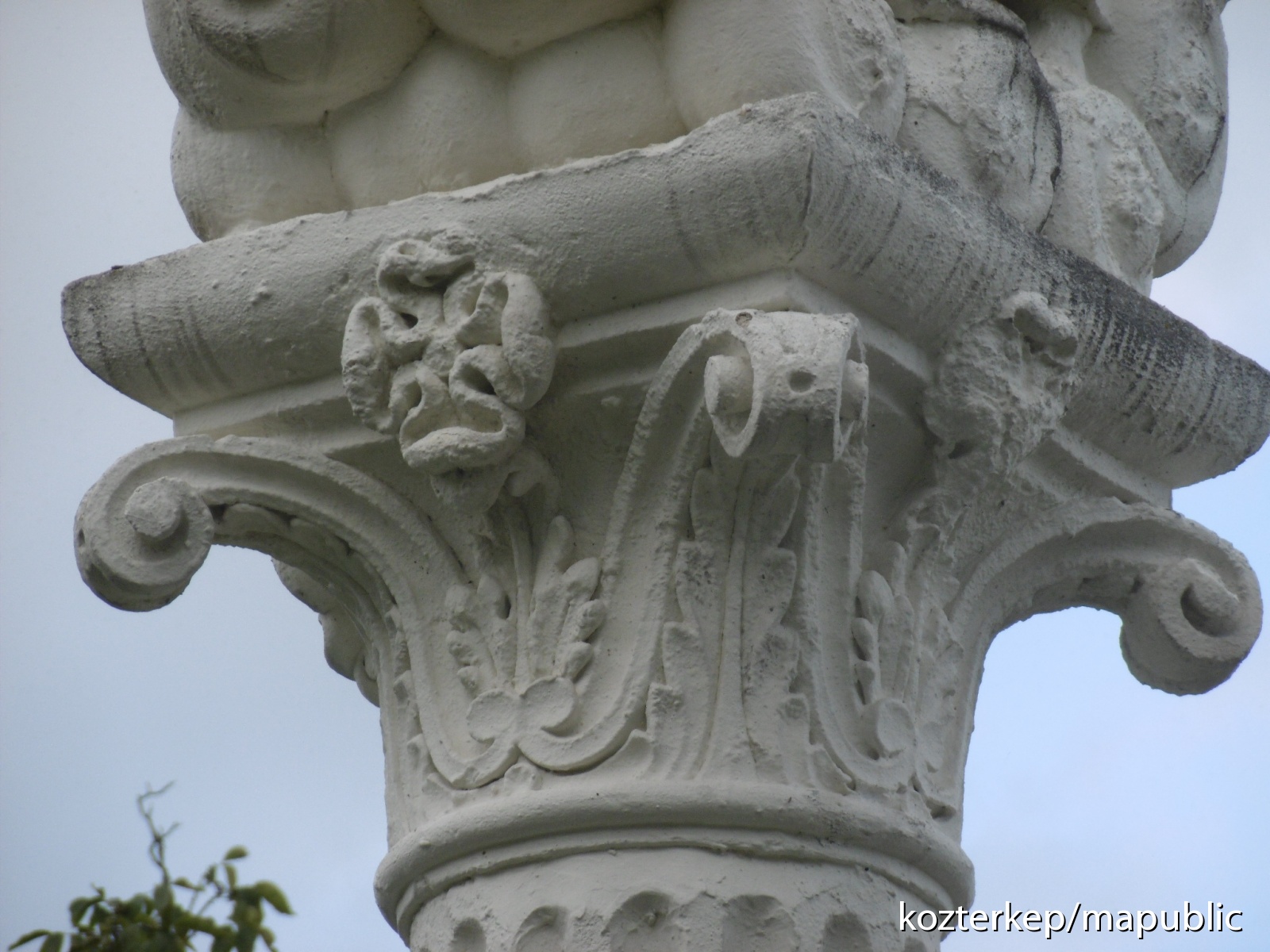 A tartóoszlop egy kannelúrás korinthoszi oszlop, amely szép oszlopfejben végződik. Ennek tetején, felhőpamacsokon egymás mellett ül az Atya és Fiú. Az idősebb arcvonású atyaisten bal kezében egy glóbuszt tart. Jézus bal kezében a keresztjét tartja, amelynek keresztfája a vállát terheli.