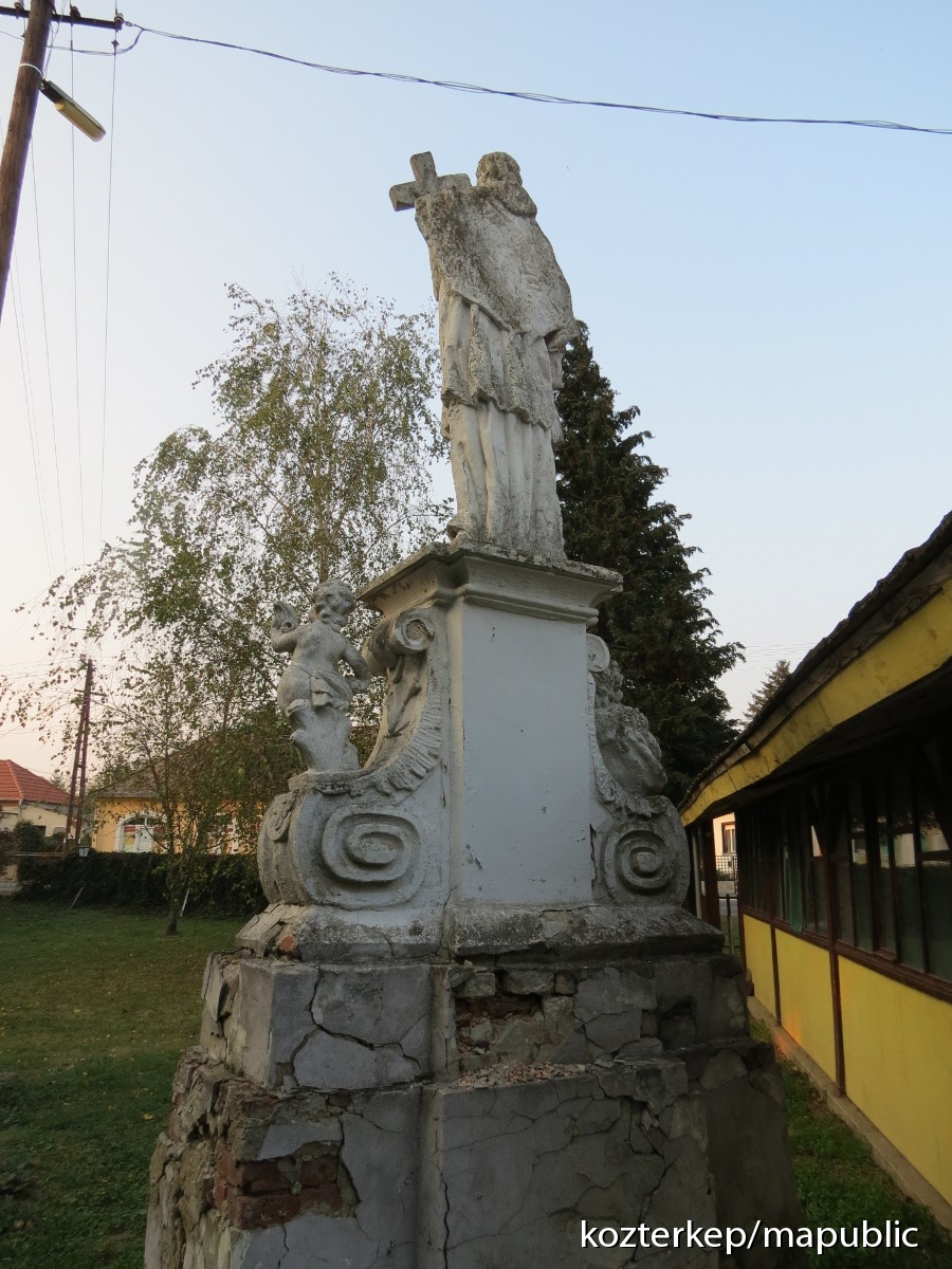 A szobor talapzata téglából van, ez jól látszik, mert a vakolata erősen omladozik. A kétoldalt egy-egy puttóval díszített talapzatán áll Nepomuki Szent János szobra. Bal kezében a feszület, jobbjában fejéről levett birétuma.