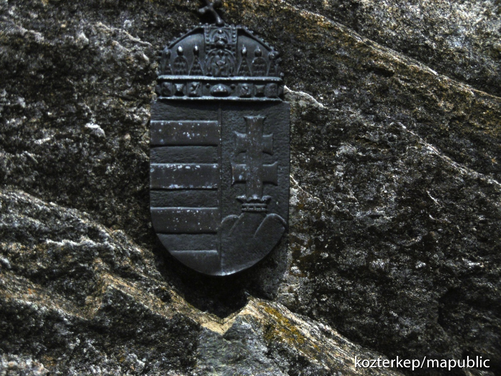 Felül egy kis méretű bronz címer van, Magyarország mai címere.