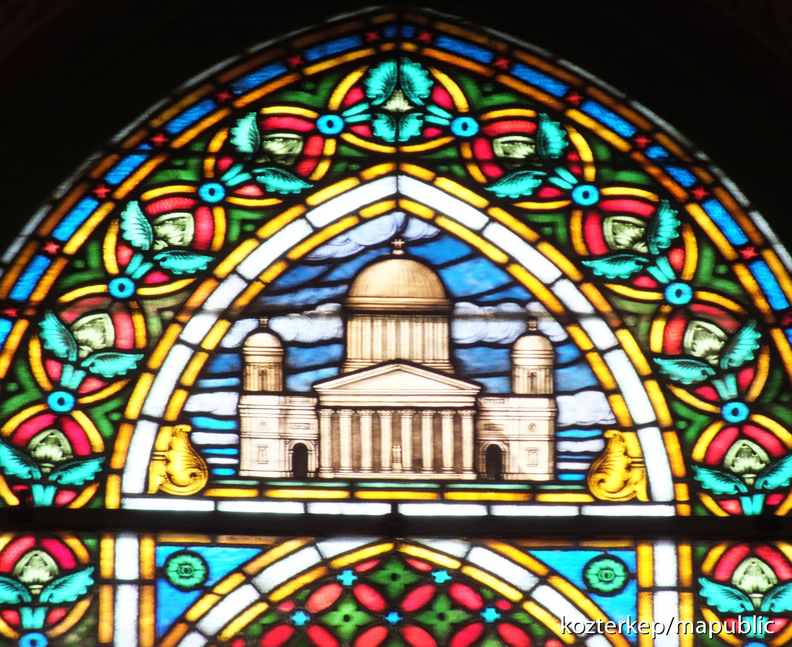 Az üvegablak felső részén az Esztergomi Bazilika látható. Szent Adalbert az Esztergomi Egyházmegye védőszentje. Az üvegablak alsó részén az örök élet forrása látható.