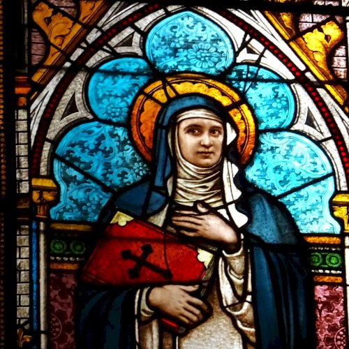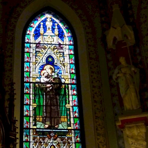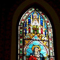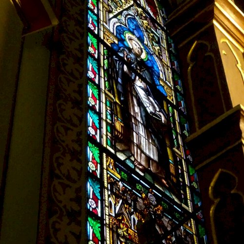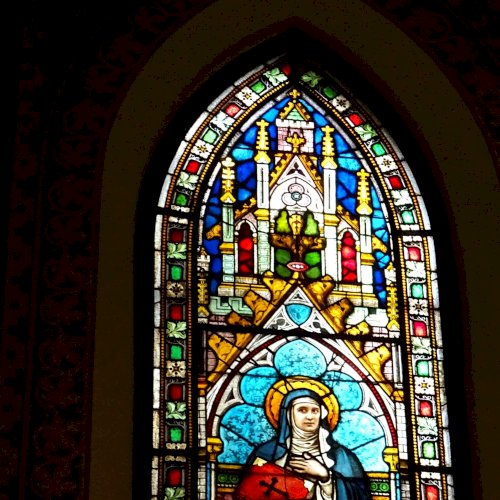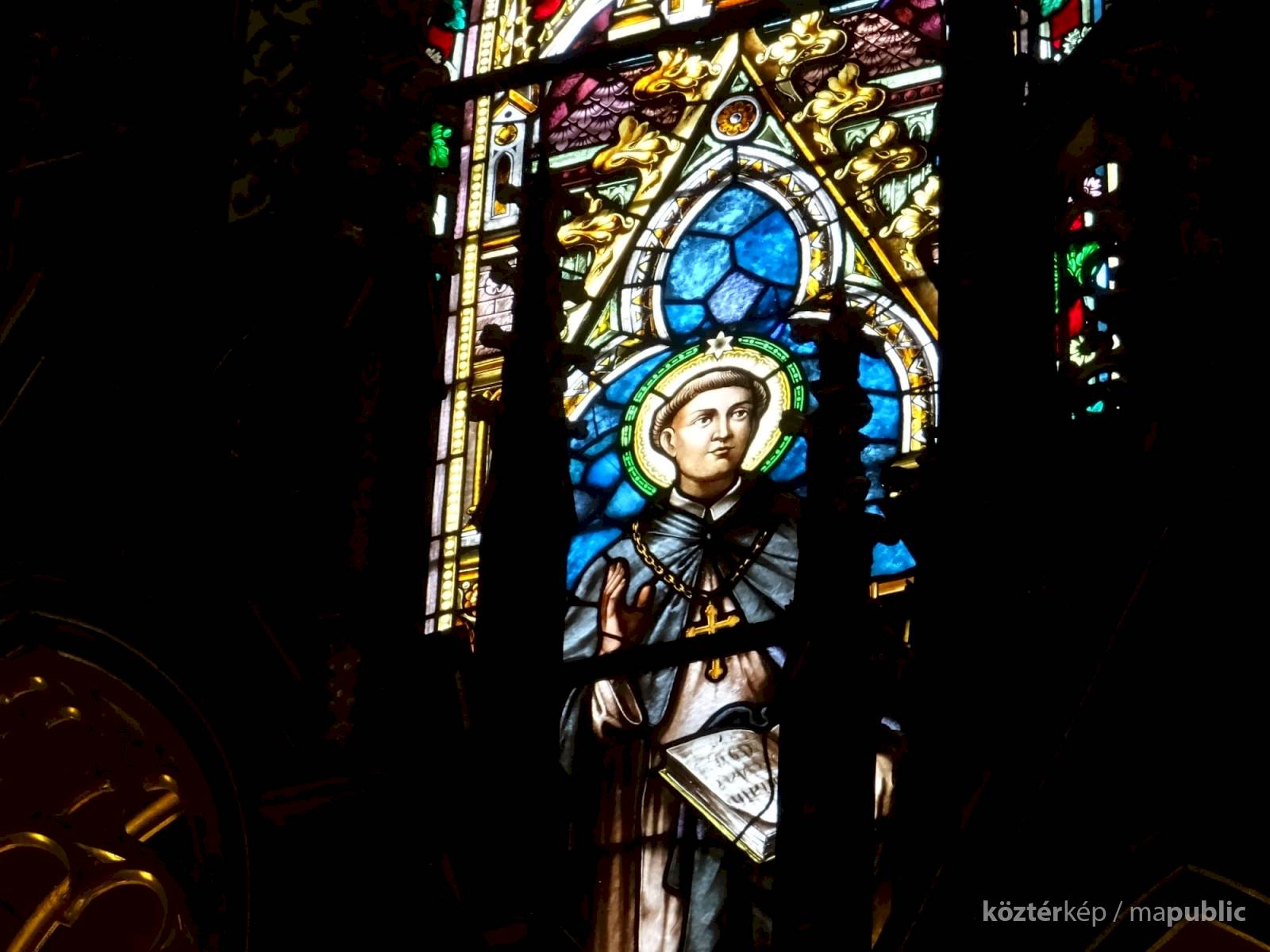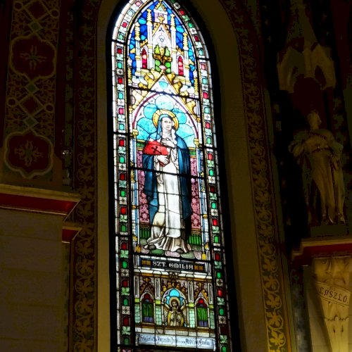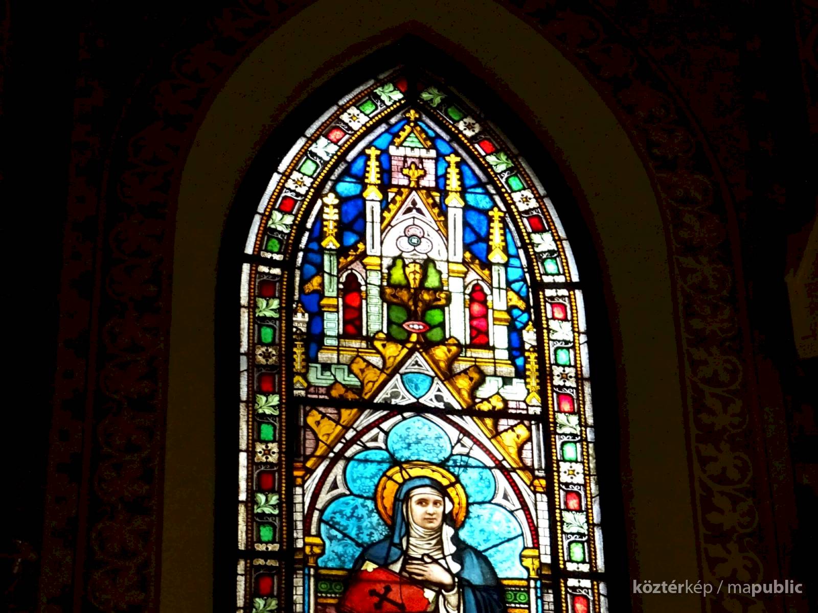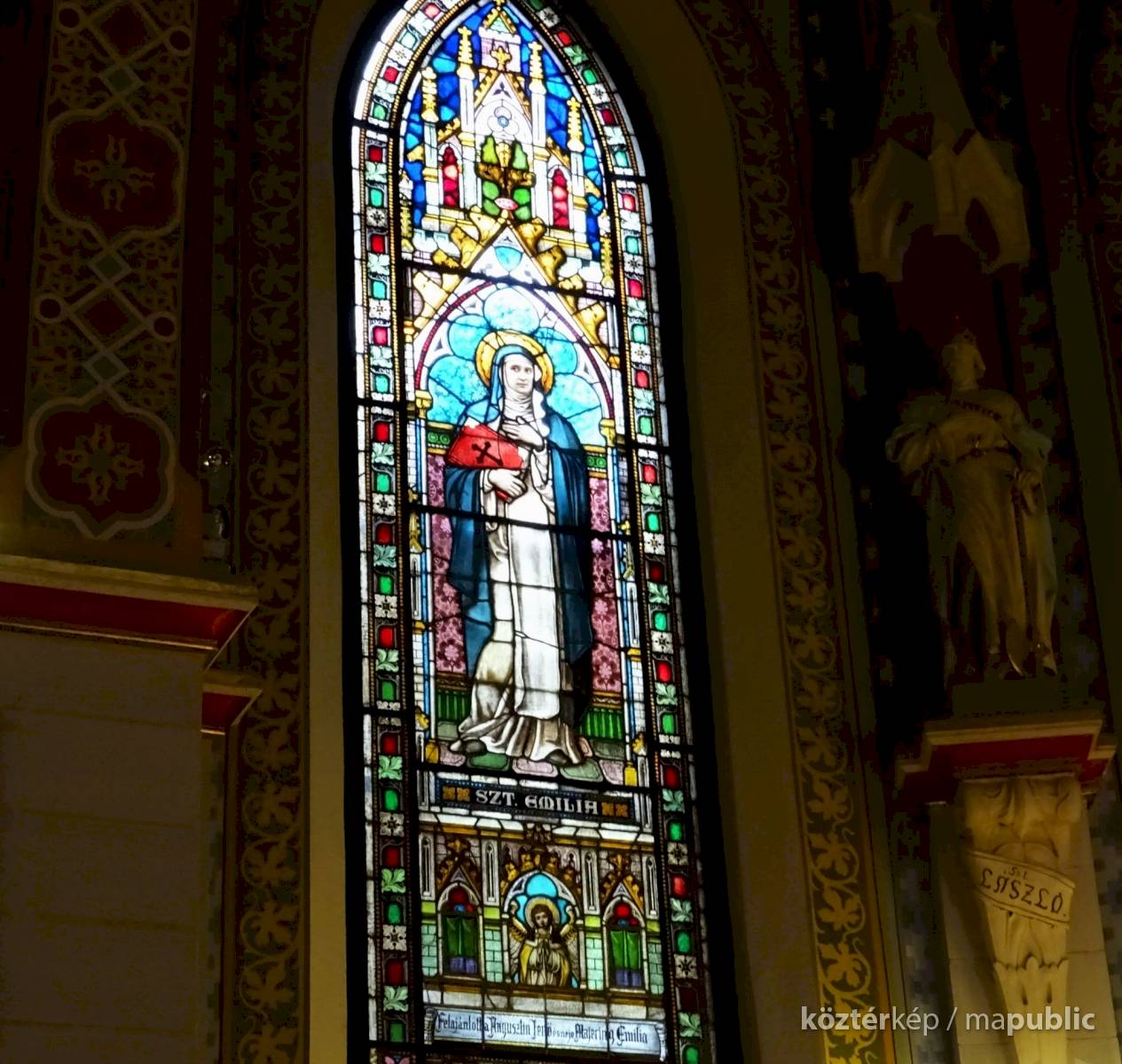 Másik üvegablak felirata Szent Emília üvegablak, pedig őt csak boldoggá avatták