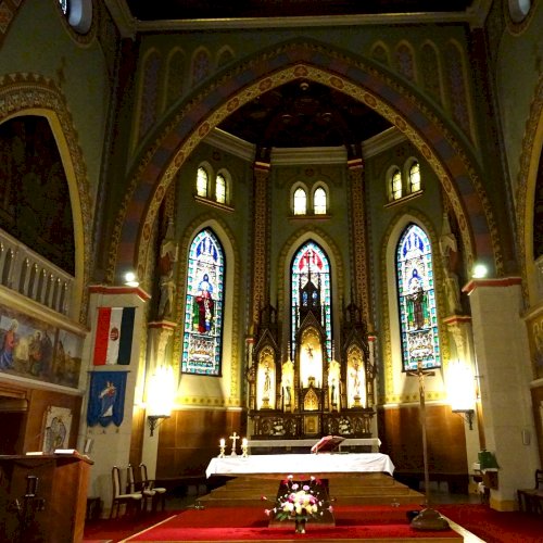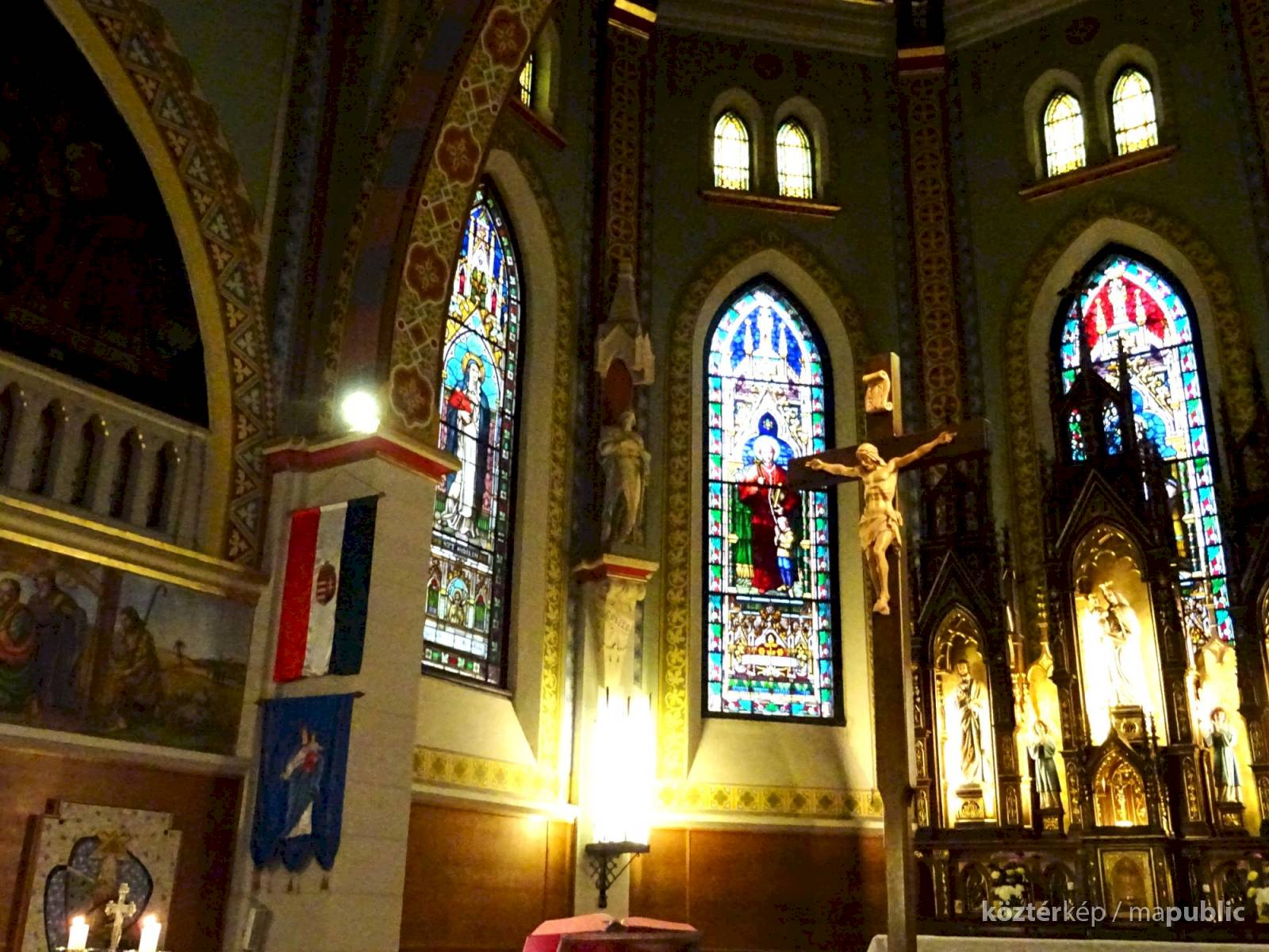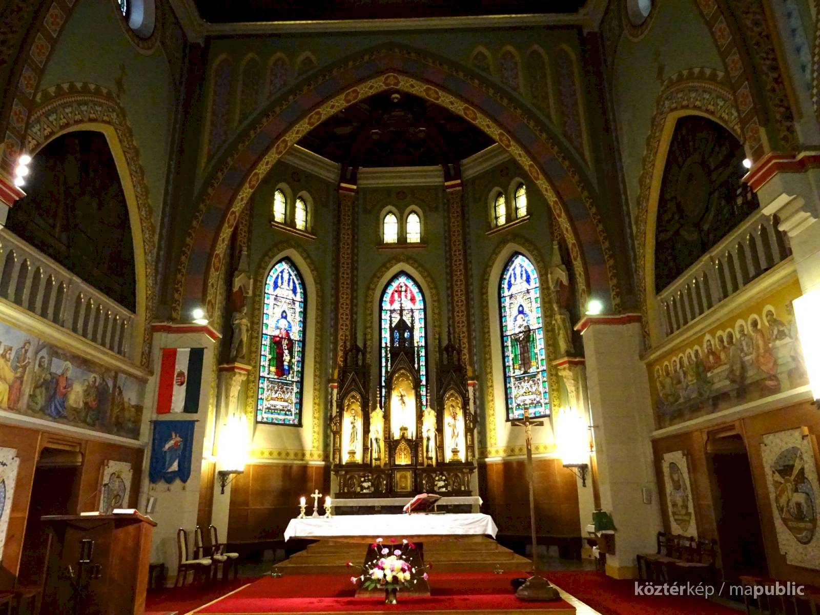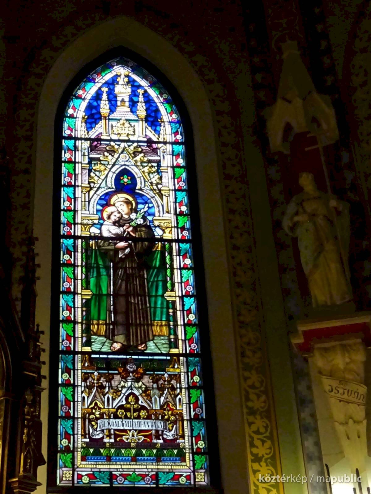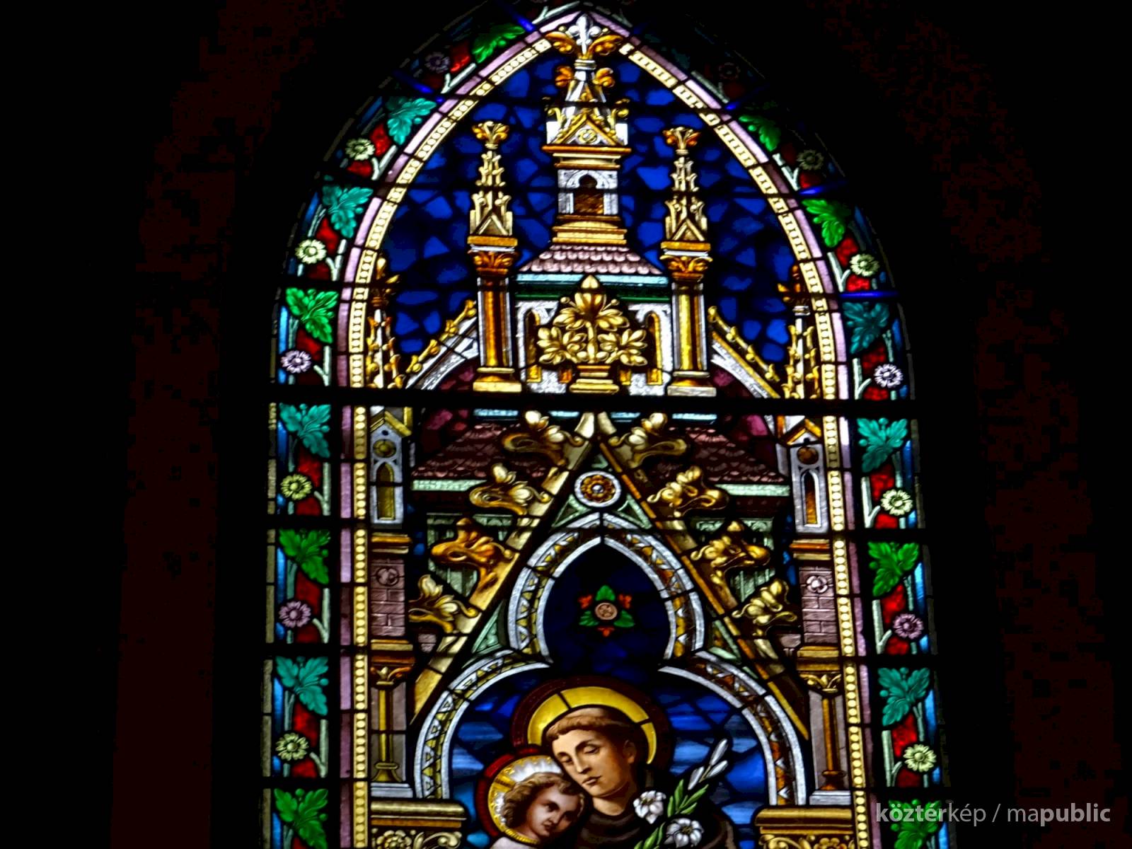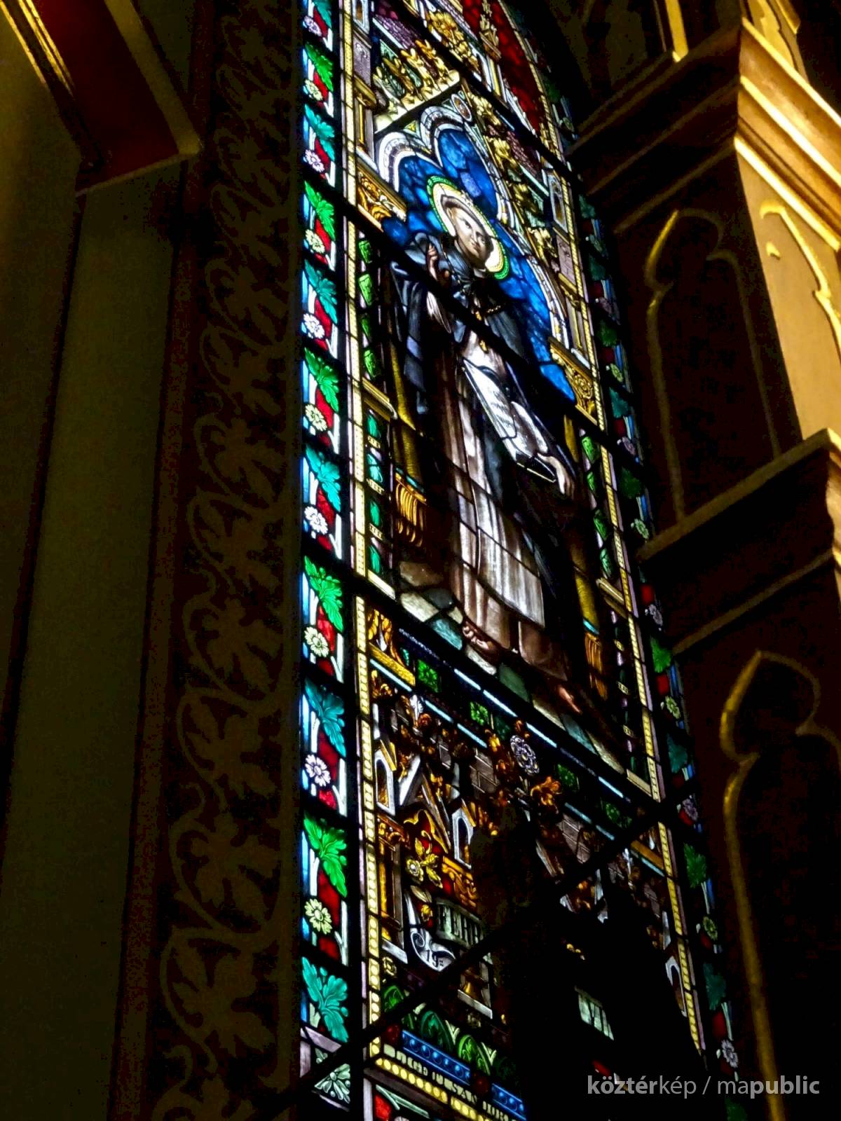 A szentély színes ablakain balról Szent Emília, Kalazanci Szent József, Ferreri Szent Vince, Páduai Szent Antal és Szent (valójában Boldog) Gizella alakja látható.