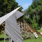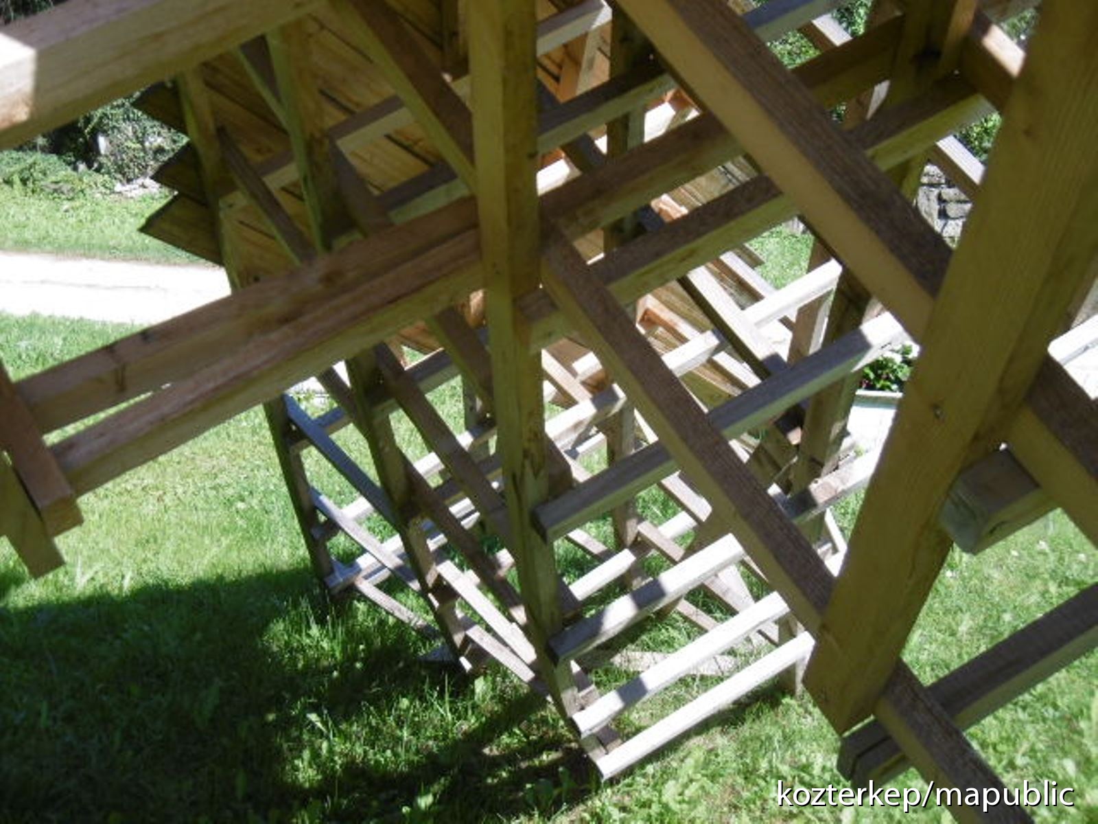 A lendületes, háromfelé szétágazó mű fából van. A gyalult lécekből összeálló rácsos tartók felső részét deszkázat borítja. Csupán az elemeket összetartó facsavarok vannak fémből.