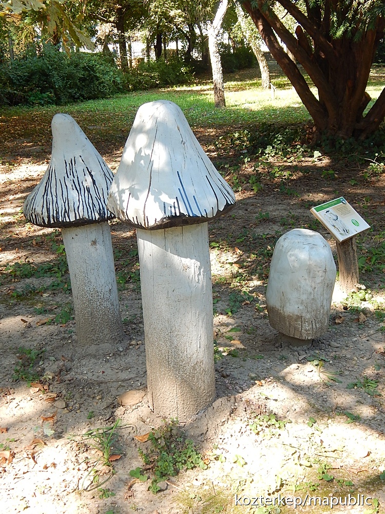 A park bejáratának jobb oldali részén fából faragott különféle gombafajok kerültek felállításra.