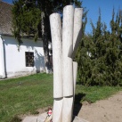 Ezen kívül van még egy művészi alkotás a nevek előtt. Ezt függőlegesen álló, 3-4 egymásba fonódó henger, vagy fatörzs alkotja. Az lentről kisarjadó, élő, ám felül levágott törzsek talán a félbevágott, félbeszakadt életeket jelképezik.