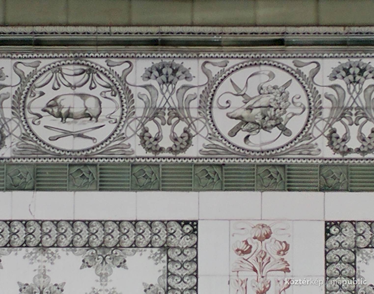 Az üzlet zöld-fehér mintás csempével borított. A felső frízben egész disznó, disznófej, sonka sorozat van virágdíszek között. A falakat zöld mintás virágos csempe borítja. Szerencsés módon a csempeburkolat változatlan állapotban fennmaradt.