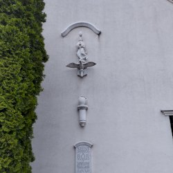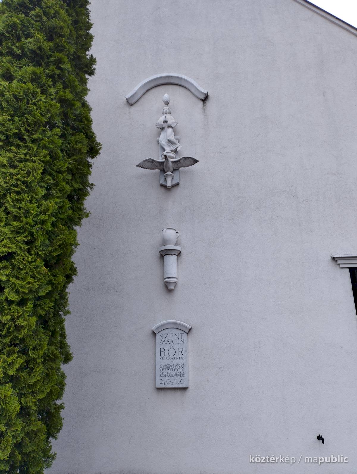 A falat lefoglaló alkotásnak több eleme van: maga Szent Márton, a bor védőszentje, akit imára kulcsolt kézzel, feje felett a jellegzetes püspöki süveggel formált meg alkotója. A legenda szerint a püspöki megbízatás ellen erősen tiltakozó, saváriai születésű Márton egy libaólba próbált elbújni, ám a ludak hangos gágogásukkal elárulták. Ezért lett jellegzetes ismertetőjele a liba, ami nem maradhatott el az itteni ábrázolásról sem.