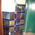 A falburkolat minden várakozásomat felülmúlta. Csodálatos színekben pompázó falburkoló elemeket tulajdonképpen egyenként is lefényképezhettem volna, hiszen két egyformát nehezen találhatnánk köztük. A lapok keskeny sötét elválasztó falburkoló-elem sávokkal változatossá tett módon kerültek felrakásra, több helyen kis bronzarany színű négyzetes elemekkel gazdagítva.