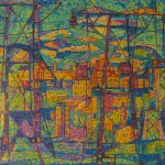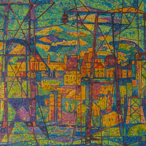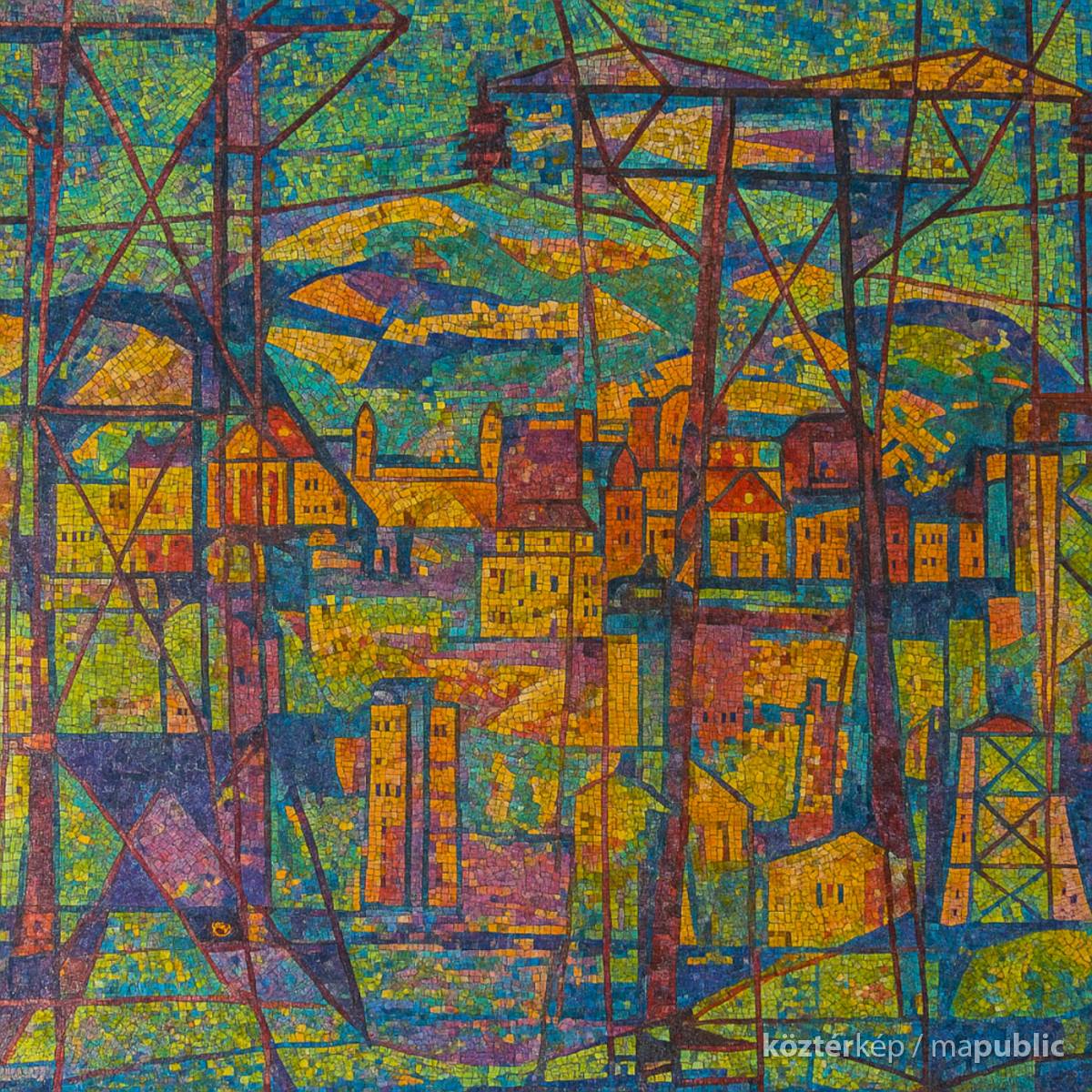 Az egykori legényszálló egyik hosszú társalgóját (ami a kollégium épületében található) feltételezhetően a 80-as években kettéválasztották egy fallal, maradt egy kisebb előadóterem és mögötte egy könyvtár. Számításaink szerint az egykori nagy társalgó közepén kellett lennie Bizse János Pécs jellegzetes épületeit ábrázoló 250*225 cm nagyságú mozaikjának. Az alkotás közepén a Széchenyi téren álló dzsámi, tőle balra a négytornyú bazilika látható. A többi épület beazonosítását meghagynám másnak. A kép előterében én kettő hatalmas villanyoszlopot véltem felfedezni. A mozaikot kerestük a könyvtárban is, hátha el van rejtve valamelyik polc mögött a galéria részen, de sajnos nem bukkantunk a nyomára.