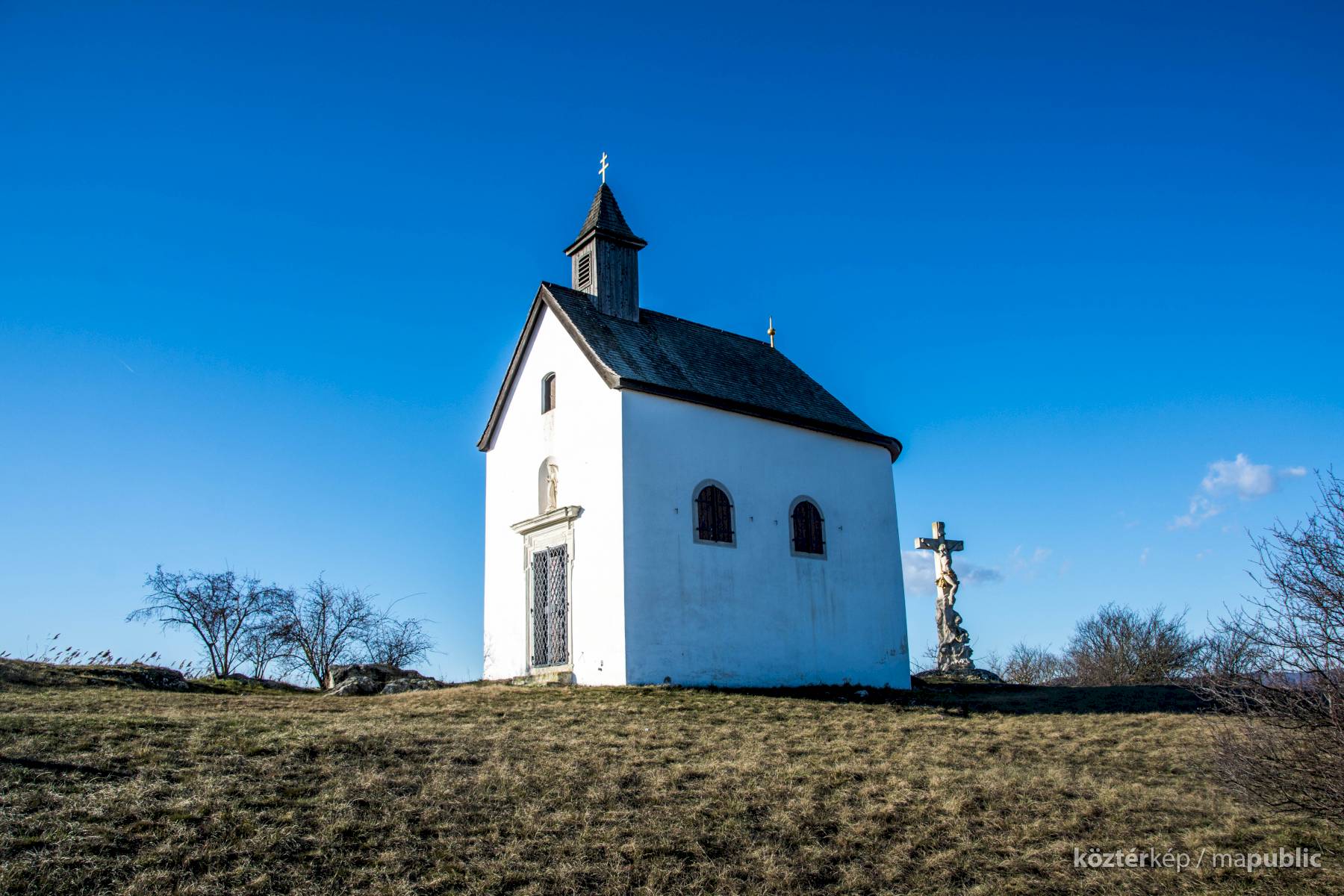 Fazsindellyel fedett egytornyos kápolna, melyen aranyozott kettős kereszt látható.