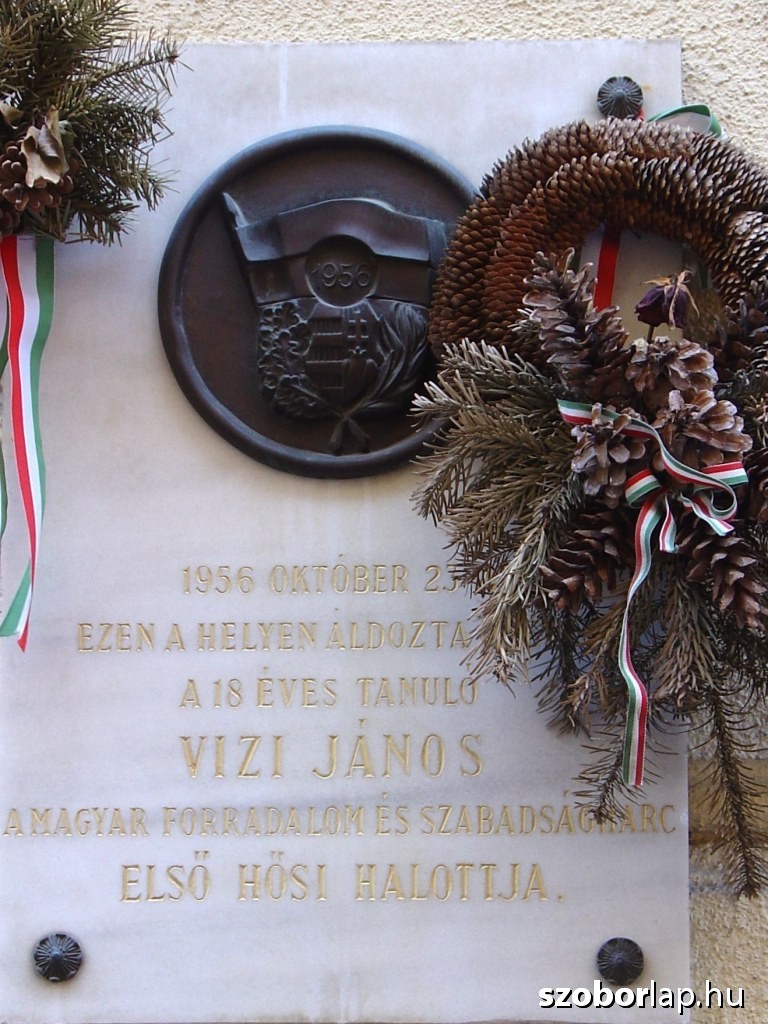 Alatta felirat: '1956 október 23-án/ezen a helyen áldozta életét/a 18 éves tanuló/VIZI JÁNOS/a magyar forradalom és szabadságharc/ELSŐ HŐSI HALOTTJA.'