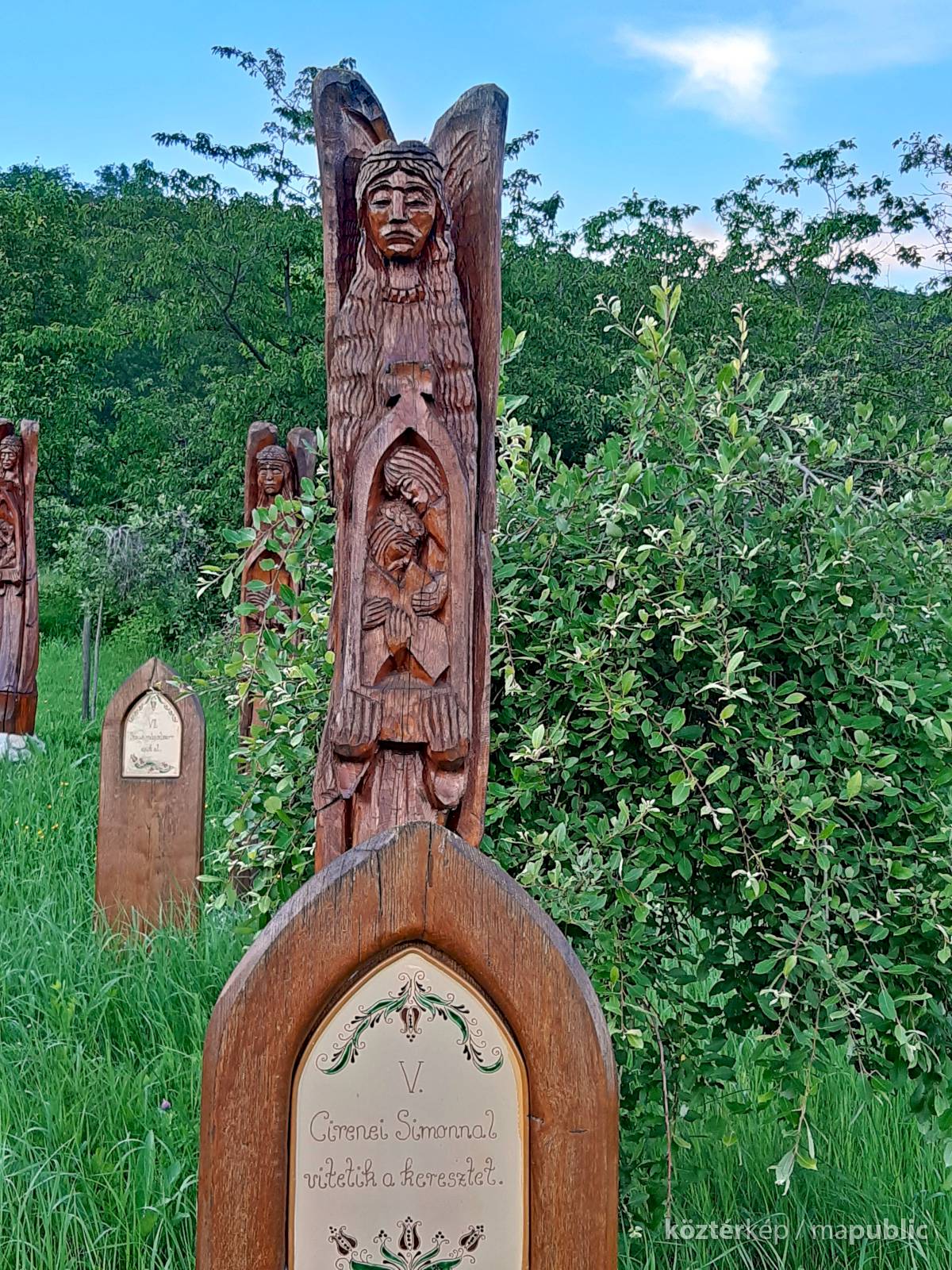 "A 14 stációjelenet úgy helyezkedik el a térben, hogy a fából készített angyalszobrok a kereszténység ősi szimbólumát, egy halformát írnak le, s a faragott angyalok mögé ültetett kiválasztott növények sem véletlenek; amikor a stációkat járva az emberi gonoszság jelenik meg Jézus elítélésénél, szomorú barka került az angyal mögé, amikor viszont az emberi jóság mutatkozik meg Veronika kendőjénél, egy rózsafa látványa nyújt hátteret. Krisztus keresztje szintén nem szokványos kereszt, hanem egy életfa motívum látható rajta megfeszítve." [1]