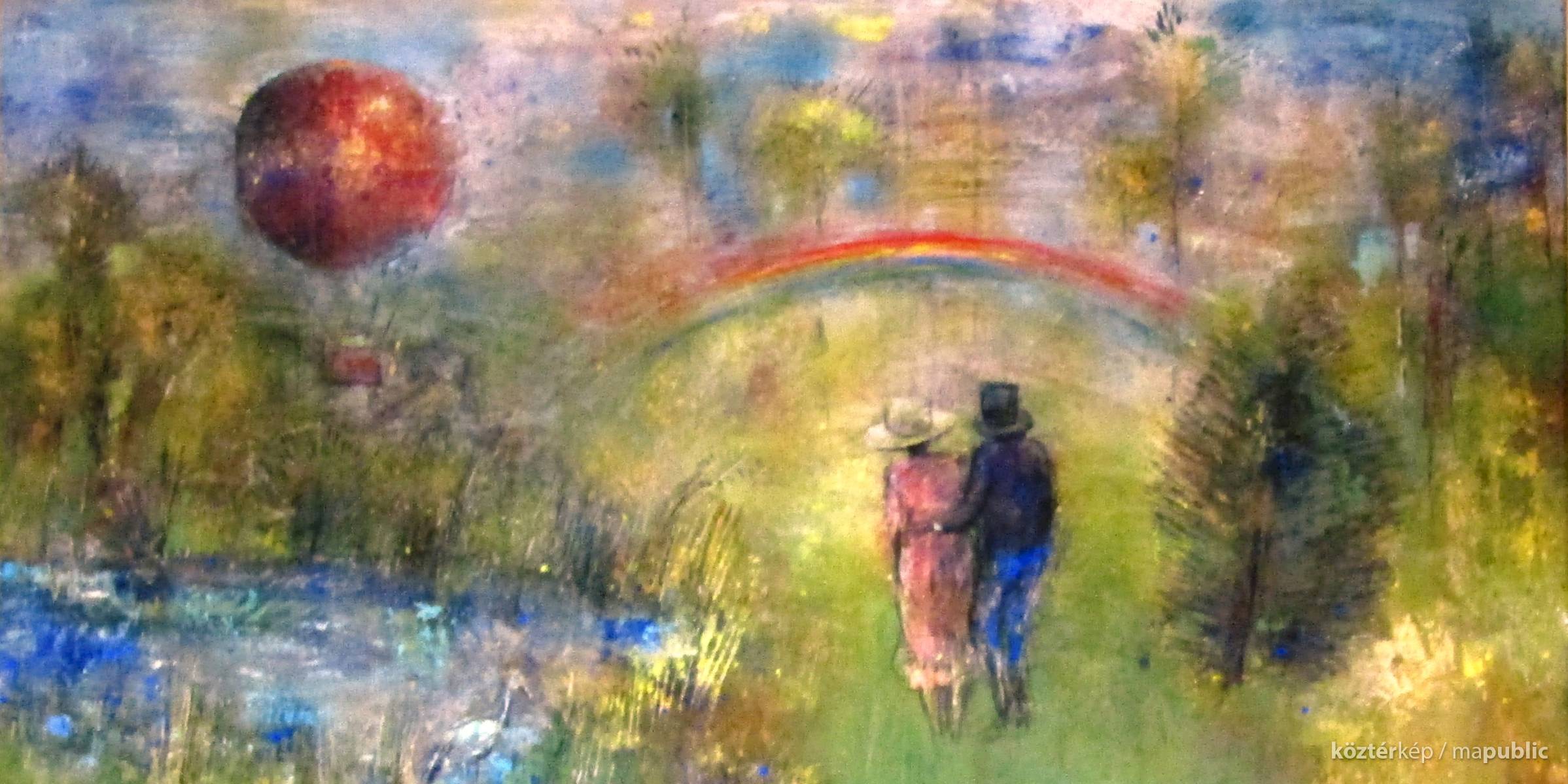 Középen a fő téma, fenn egy szivárvány ível át a képen, amely alatt sétál egy fiatal pár kalapban, háttal. Bal oldalon egy piros léghajó repül, alatta tavacska, szélén a nádasban egy gém sétál, alul egy kalapos lány lepkével a kezén, balra páva áll.