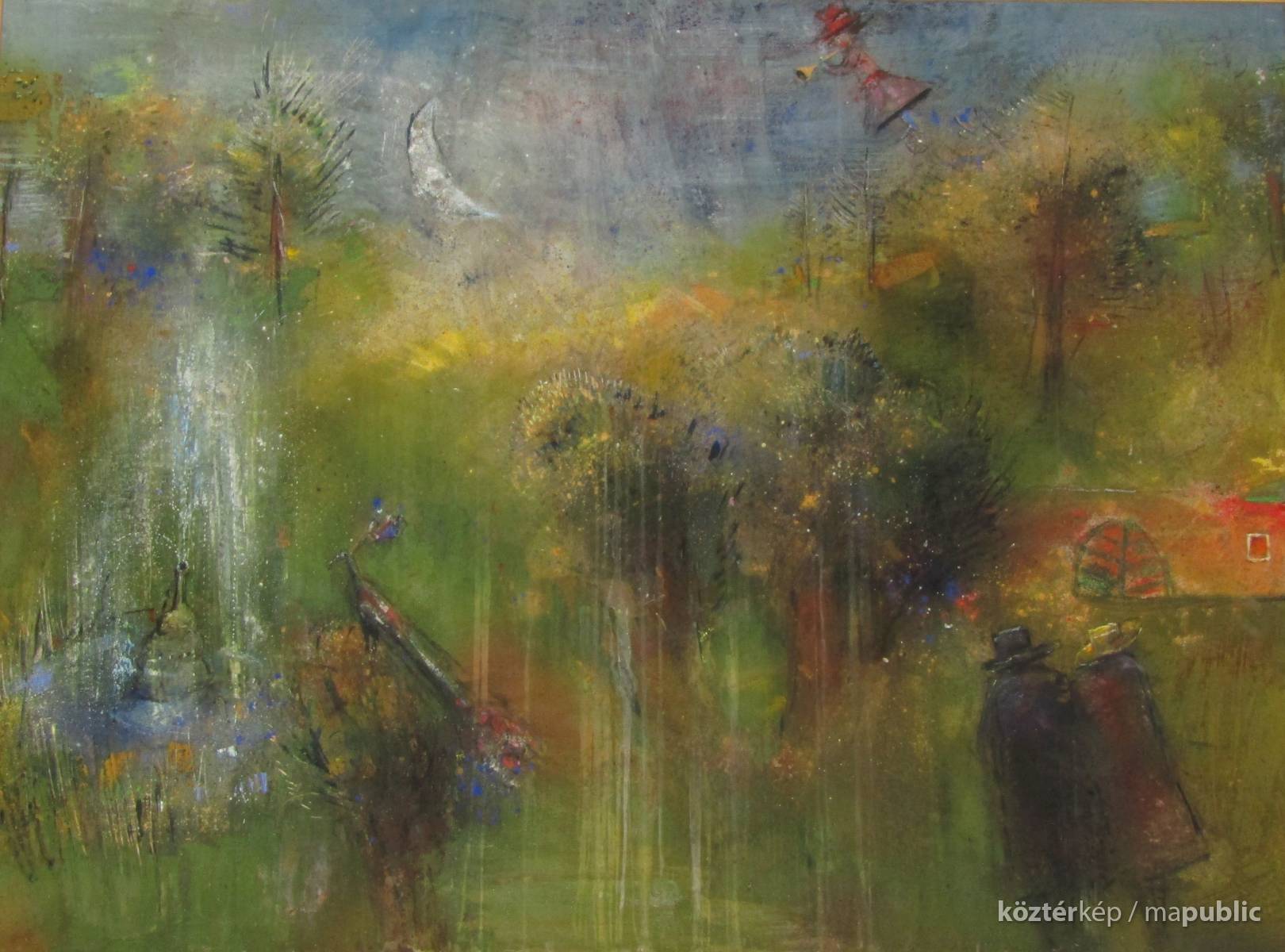 Jobb oldalon fenn egy idős házaspár sétál a keskeny holdfényben, egy fák mögötti ház irányába indulnak, háttal ábrázolja a festő őket. A felhőkön trombitálva gurul egy bohóc, bal oldalán egy szökőkút, és egy páva. Az egész alkotást az élénk színek jellemzik, modern figurák, az élet vidám oldala sugárzik.