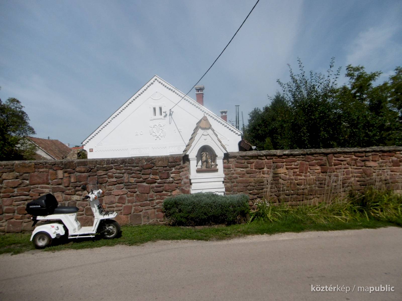 Ebben a faluban kő van bőven. Sok más épülethez hasonlóan ezt a házat is kőkerítés övezi. Utólag a kerítést egy kis szakaszon megbontották és beleépítettek egy képoszlopot. Annak nyílása az utca felé van és a benne levő szobor csak onnan látható. A képoszlop talapzatának alján ez van: MMXI. Eszerint a képoszlop 2011-ben létesült és a szobor is akkor került ide.
