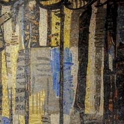"Egy évvel később fejezte be az Egressy úti Szakmunkásképző Intézet előcsarnoka számára készült Ifjúság című mozaikját. Az izokefália* [5] törvényei szerint elhelyezett, ritmikusan csoportosított, az ifjúság munkáját, szórakozását megörökítő alakokat kétoldalt erősen elvonatkoztatott formavilág - balról épületállványozást érzékeltető, jobbra a növekedő természetet megjelenítő fák - fogják közre. A pompás színellentétekre és színkiegészítésekre épített, velencei vetrosóból, valamint fehér és szürke márványból rakott mozaik a jövőt jelképezi."
