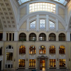 Ebből a cikkből tudtam meg, az eddig már többször, de utoljára 2017 tavaszán fotózott több száz négyzetméter üvegablaknak az alkotóját, mely Róth Miksa volt. A legnagyobb üvegfelület íves, a cikkben kupolaként emlegetik, de persze nincs kupolája az egyetemnek. A nagyméretű díszudvar fölött helyezkedik el, és főleg sávokban díszített geometrikus formákból és virágmintákból áll.