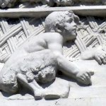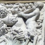 A dombormű kecskebőrös, farkas, lábas síposainak szarva még nem jelent meg. Fiatal állapotuk nem gátolja őket a hasonlókorú szüzekkel történő mozgalmas vigadalomban. A rúdon hordozott áll arca a vigadalom főistenének jelenlétére utal.
