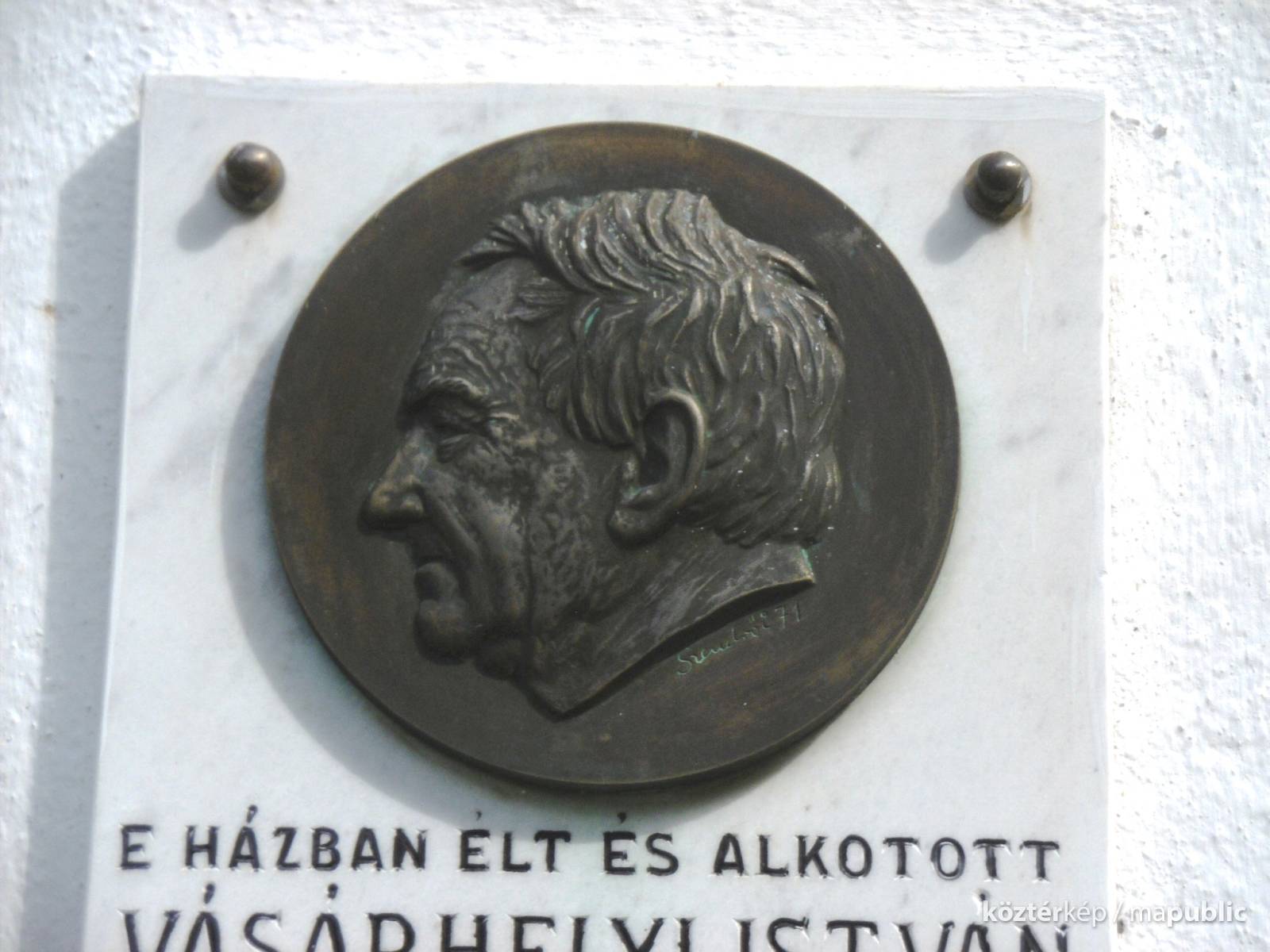 A tábla felső részén van a kör alakú bronz dombormű. A fejkép alján alkotói szignó és évszám látható: Szendrői '71. Ő Szendrői Árpád ötvösművész. A dombormű 1971-es.